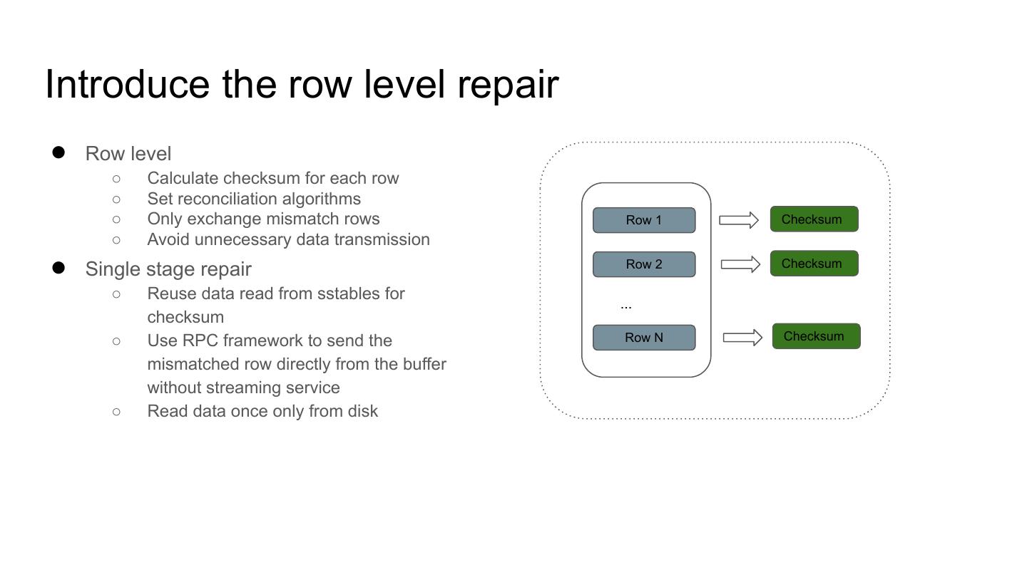 5 .Introduce the row level repair ● Row level ○ Calculate checksum for each row ○ Set reconciliation algorithms ○ Only exchange mismatch rows Row 1 Checksum ○ Avoid unnecessary data transmission ● Single stage repair Row 2 Checksum ○ Reuse data read from sstables for ... checksum ○ Use RPC framework to send the Row N Checksum mismatched row directly from the buffer without streaming service ○ Read data once only from disk