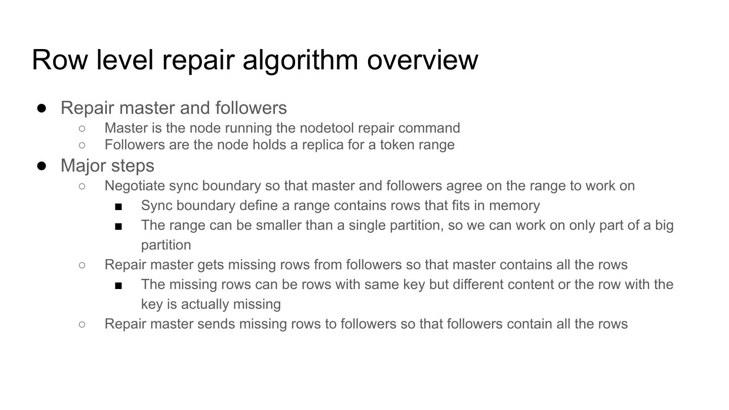 7 .Row level repair algorithm overview ● Repair master and followers ○ Master is the node running the nodetool repair command ○ Followers are the node holds a replica for a token range ● Major steps ○ Negotiate sync boundary so that master and followers agree on the range to work on ■ Sync boundary define a range contains rows that fits in memory ■ The range can be smaller than a single partition, so we can work on only part of a big partition ○ Repair master gets missing rows from followers so that master contains all the rows ■ The missing rows can be rows with same key but different content or the row with the key is actually missing ○ Repair master sends missing rows to followers so that followers contain all the rows