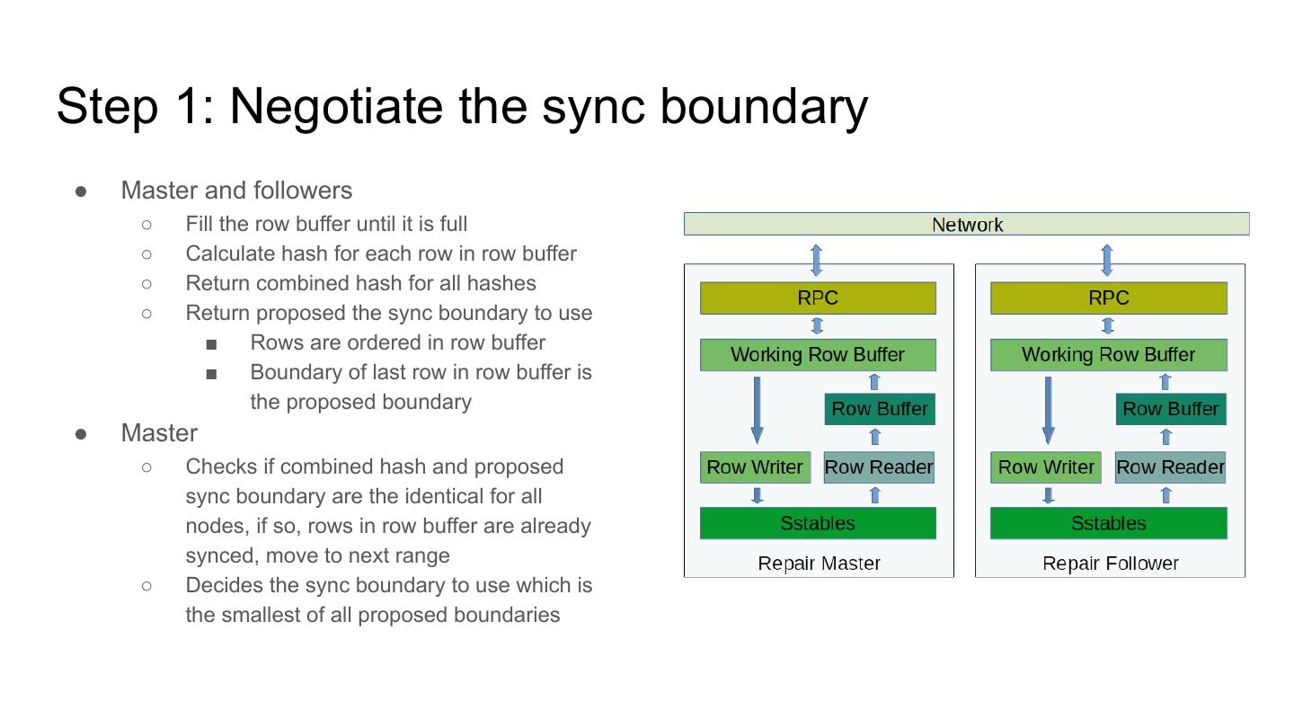 8 .Step 1: Negotiate the sync boundary ● Master and followers ○ Fill the row buffer until it is full ○ Calculate hash for each row in row buffer ○ Return combined hash for all hashes ○ Return proposed the sync boundary to use ■ Rows are ordered in row buffer ■ Boundary of last row in row buffer is the proposed boundary ● Master ○ Checks if combined hash and proposed sync boundary are the identical for all nodes, if so, rows in row buffer are already synced, move to next range ○ Decides the sync boundary to use which is the smallest of all proposed boundaries