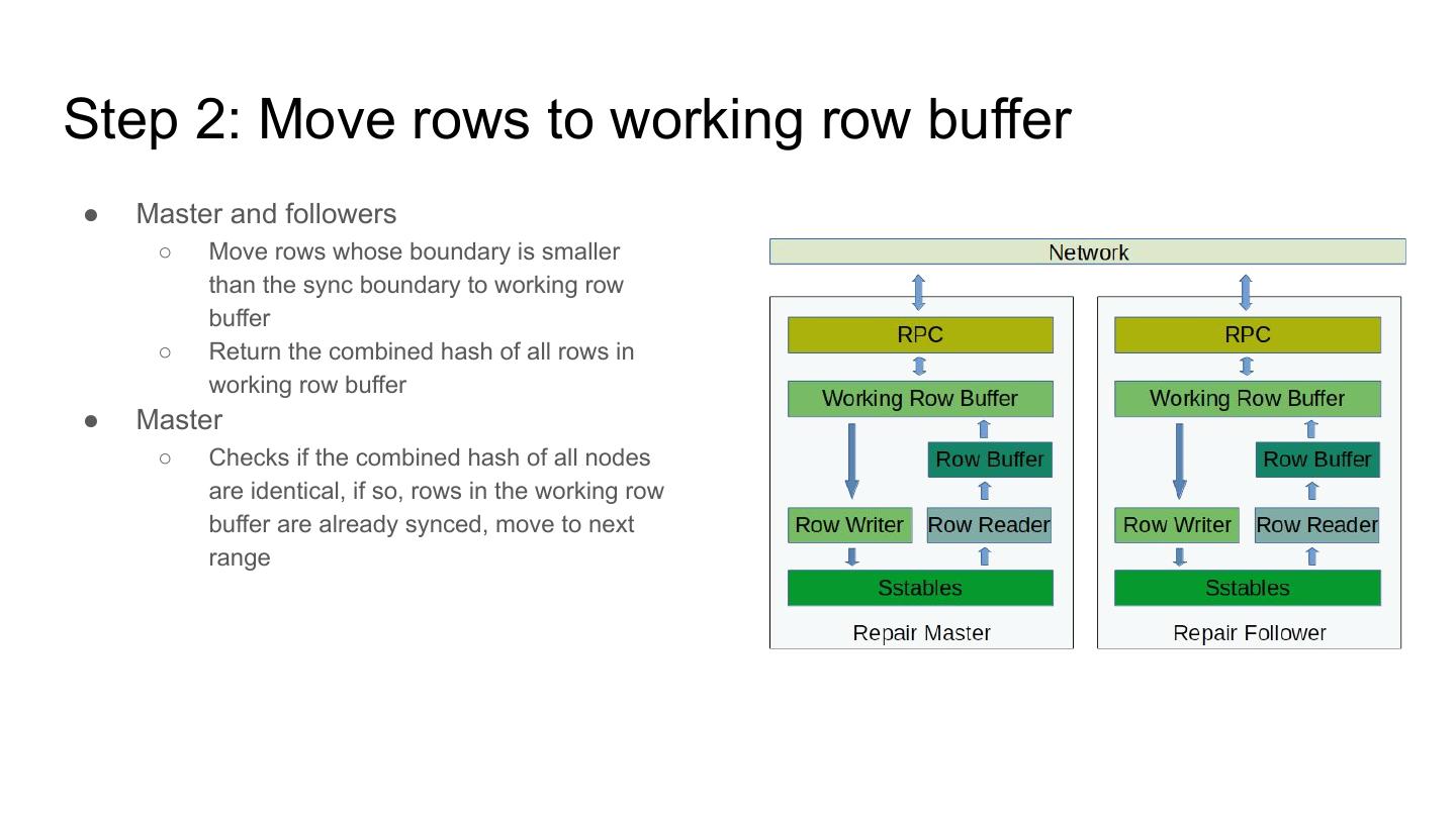 9 .Step 2: Move rows to working row buffer ● Master and followers ○ Move rows whose boundary is smaller than the sync boundary to working row buffer ○ Return the combined hash of all rows in working row buffer ● Master ○ Checks if the combined hash of all nodes are identical, if so, rows in the working row buffer are already synced, move to next range