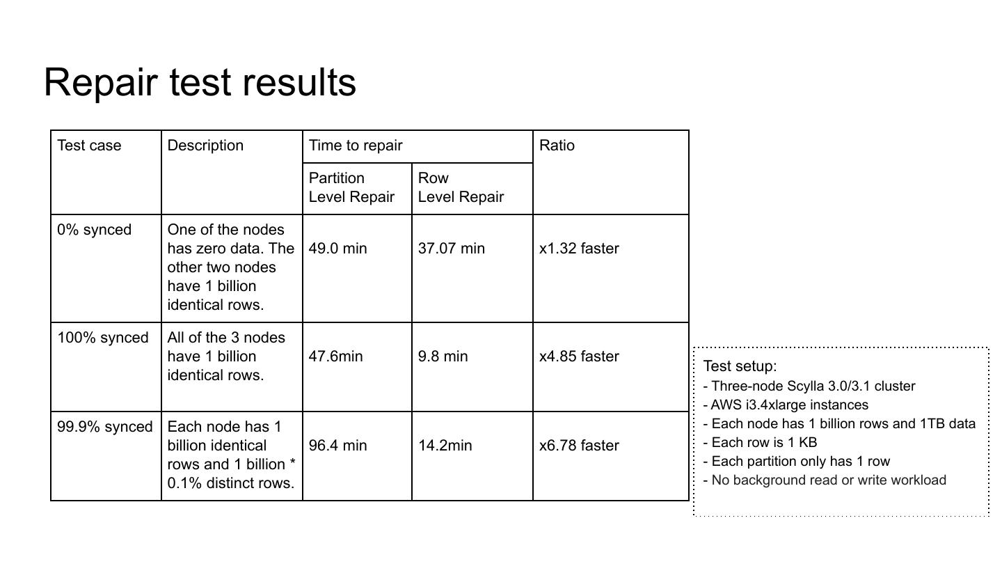 15 .Repair test results Description Partition Level Repair Row Level Repair Transfer data ratio Bytes sent on wire for 120.52 GiB 4.28 GiB 3.6% 99.9% synced case on master Bytes received on wire for 60.09 GiB 2.14 GiB 3.6% 99.9% synced case on master
