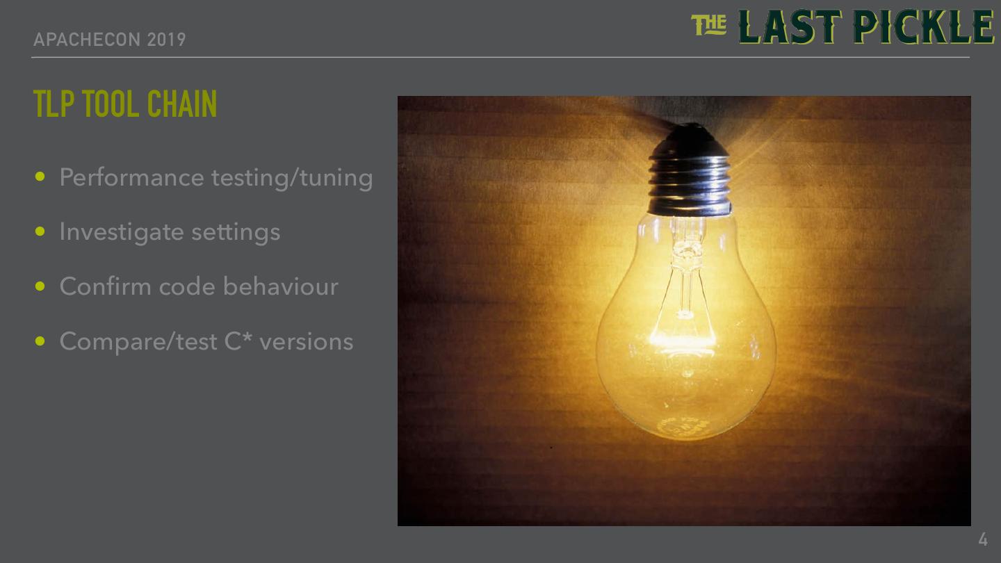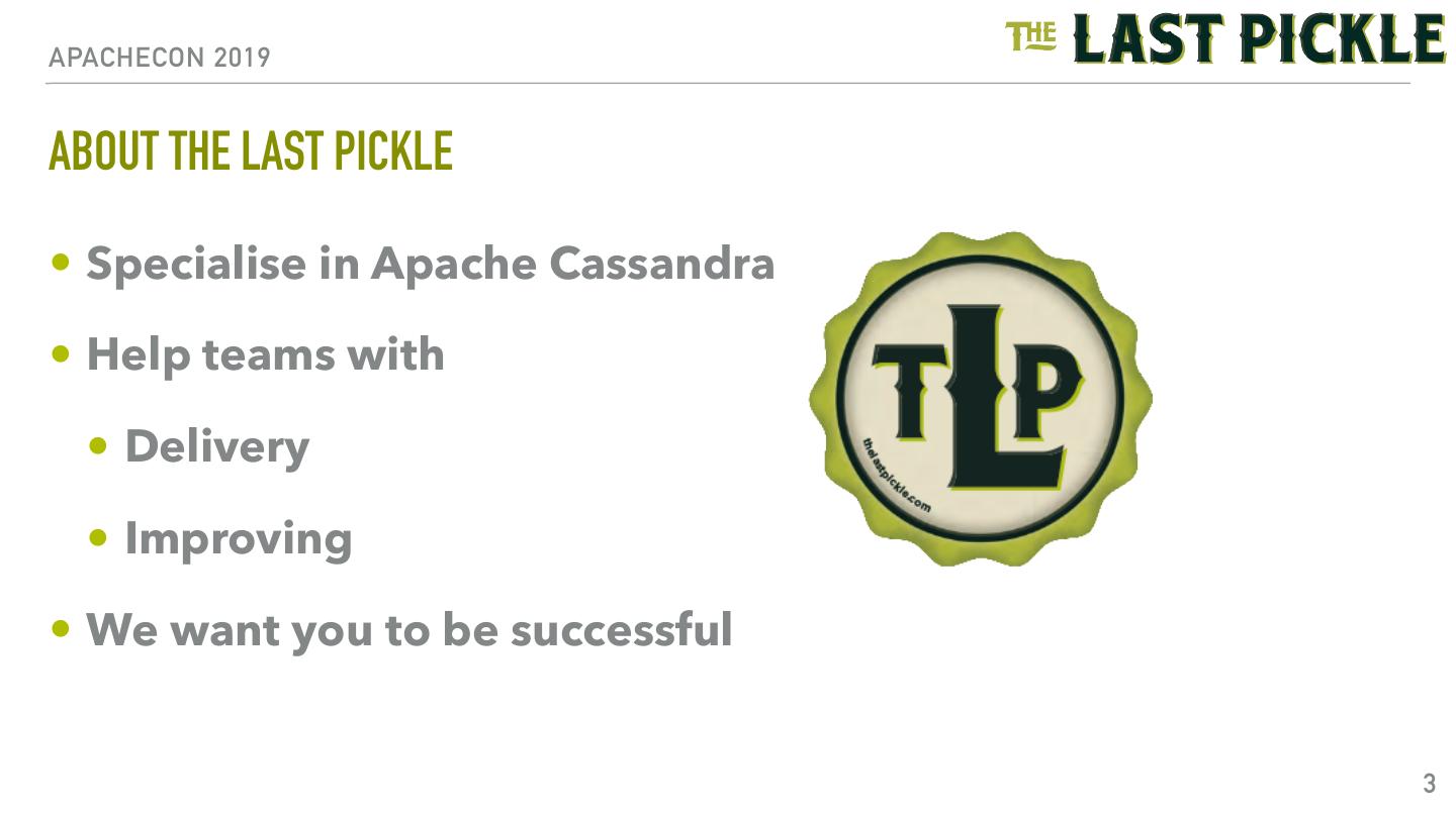 3 .APACHECON 2019 ABOUT THE LAST PICKLE • Specialise in Apache Cassandra • Help teams with • Delivery • Improving • We want you to be successful 3