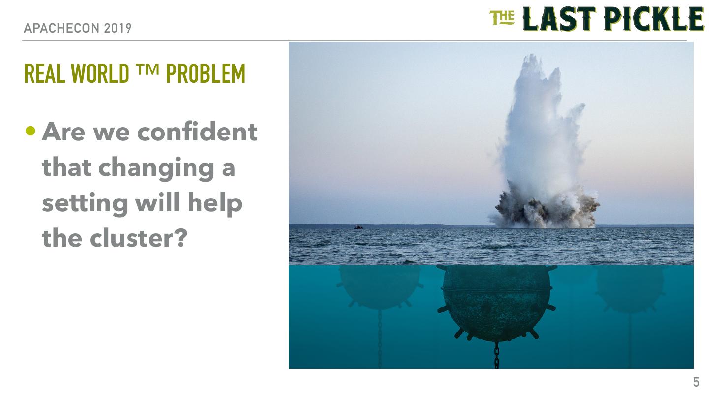 5 .APACHECON 2019 REAL WORLD ™ PROBLEM • Are we confident that changing a setting will help the cluster? 5