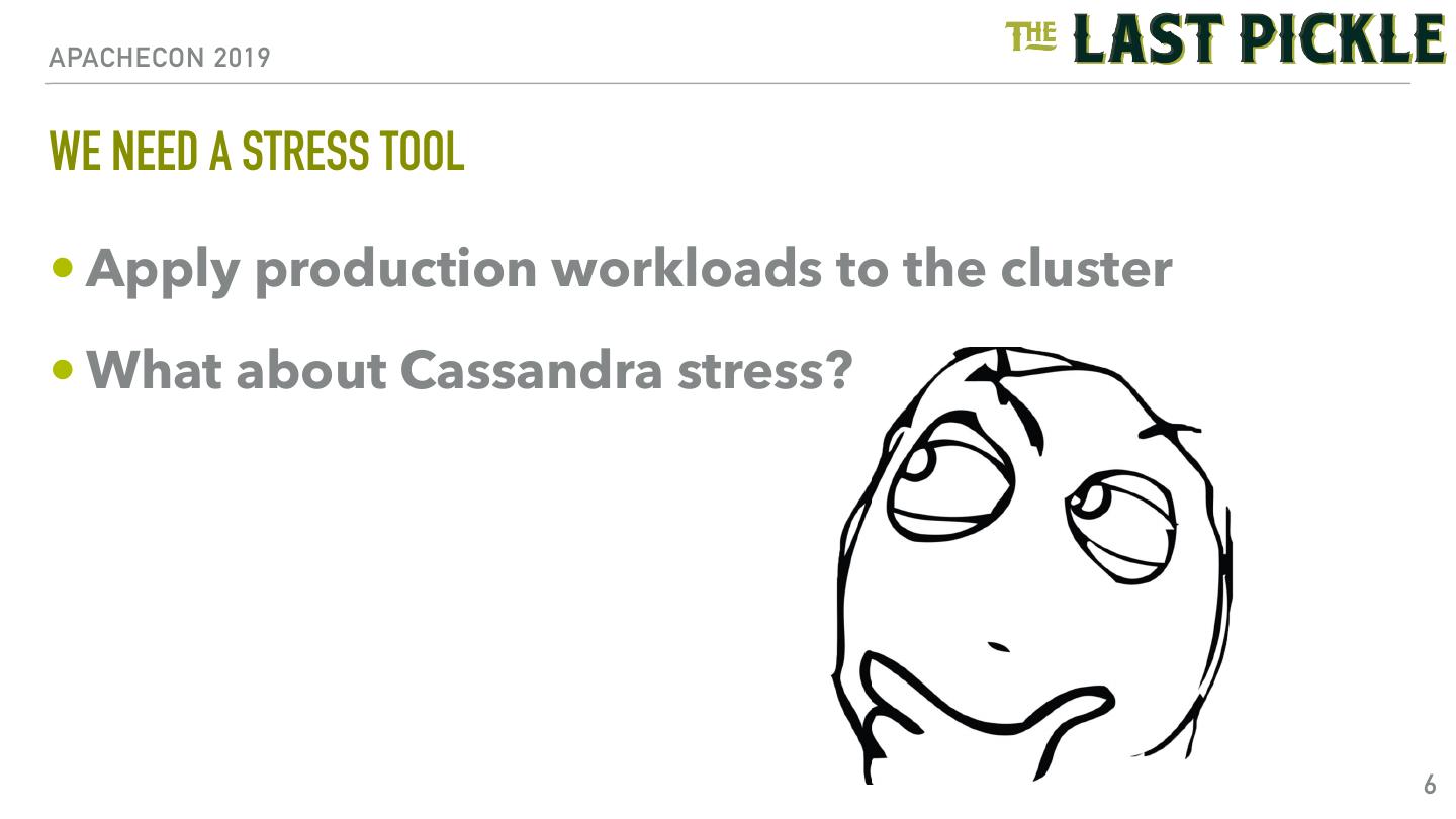 6 .APACHECON 2019 WE NEED A STRESS TOOL • Apply production workloads to the cluster • What about Cassandra stress? 6