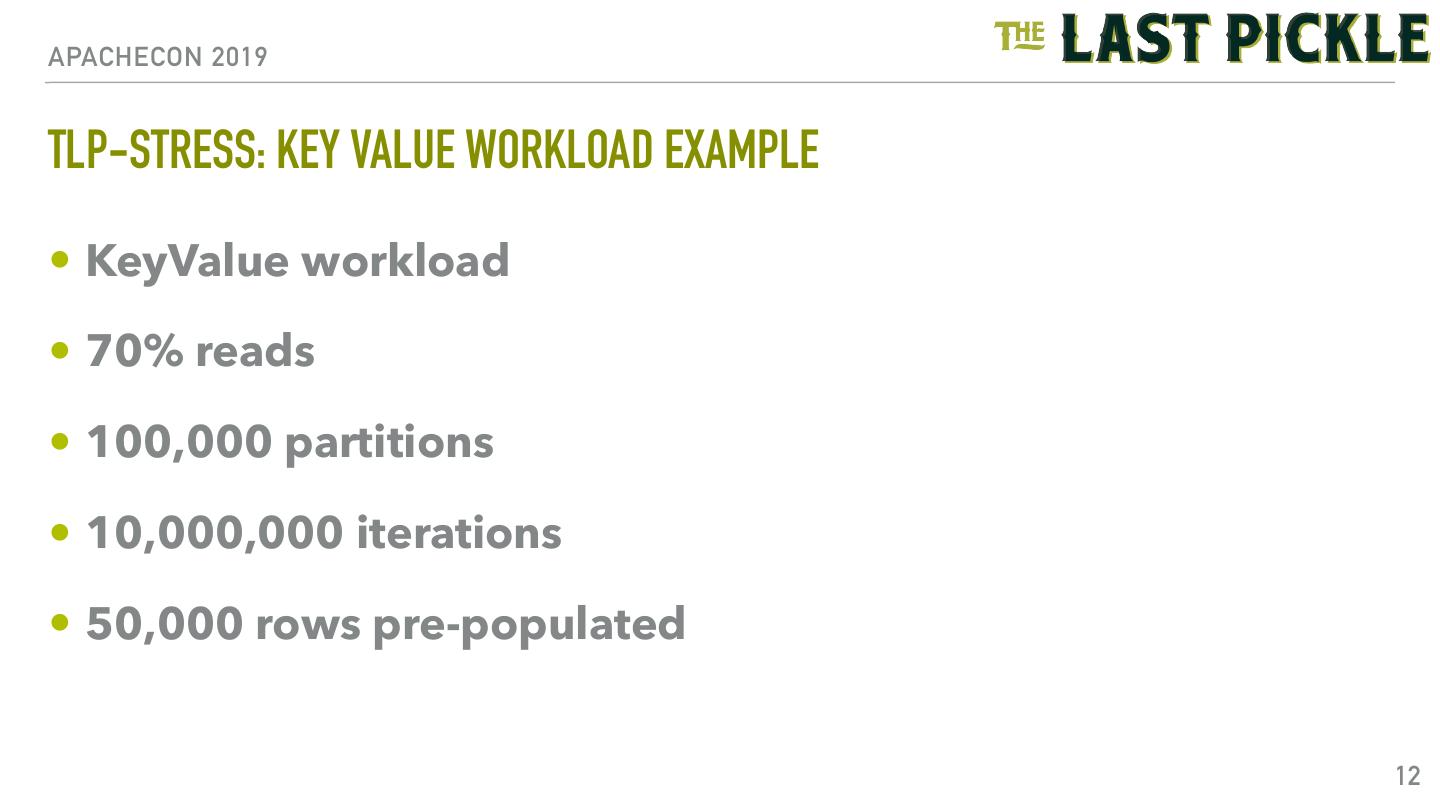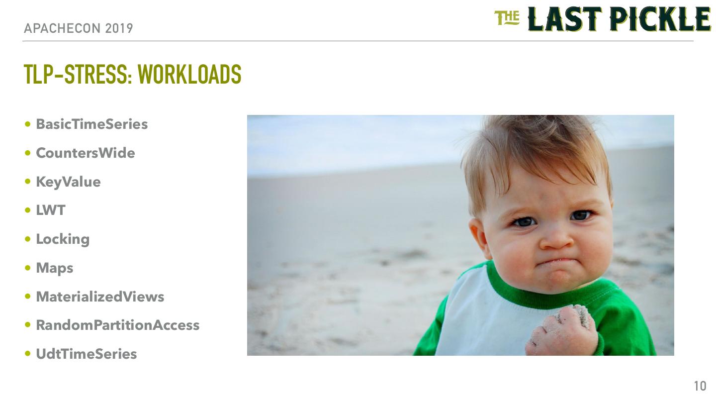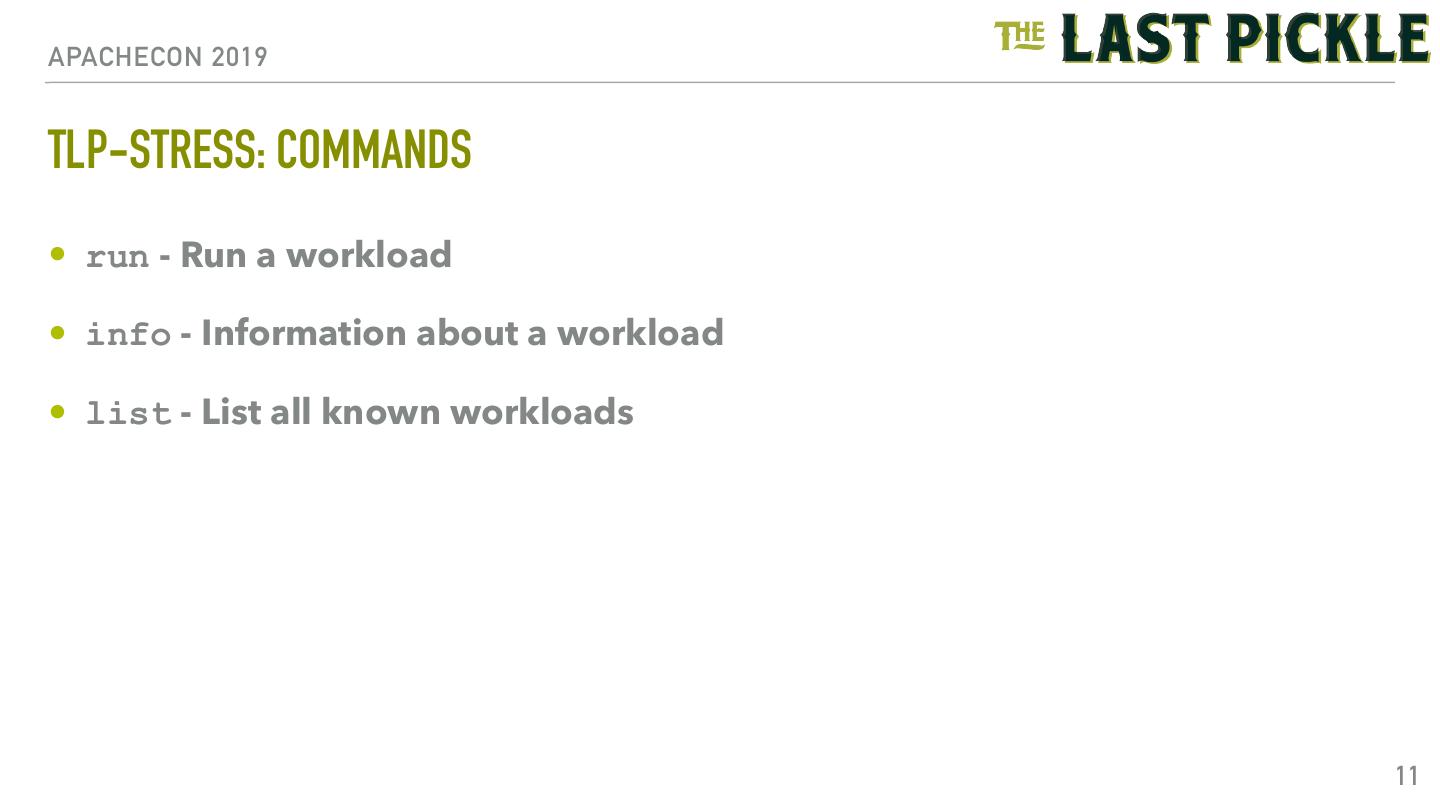 10 .APACHECON 2019 TLP-STRESS: WORKLOADS • BasicTimeSeries • CountersWide • KeyValue • LWT • Locking • Maps • MaterializedViews • RandomPartitionAccess • UdtTimeSeries 10
