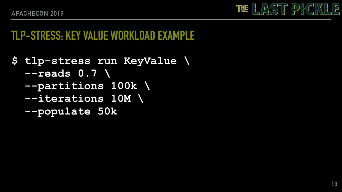 12 .APACHECON 2019 TLP-STRESS: KEY VALUE WORKLOAD EXAMPLE • KeyValue workload • 70% reads • 100,000 partitions • 10,000,000 iterations • 50,000 rows pre-populated 12