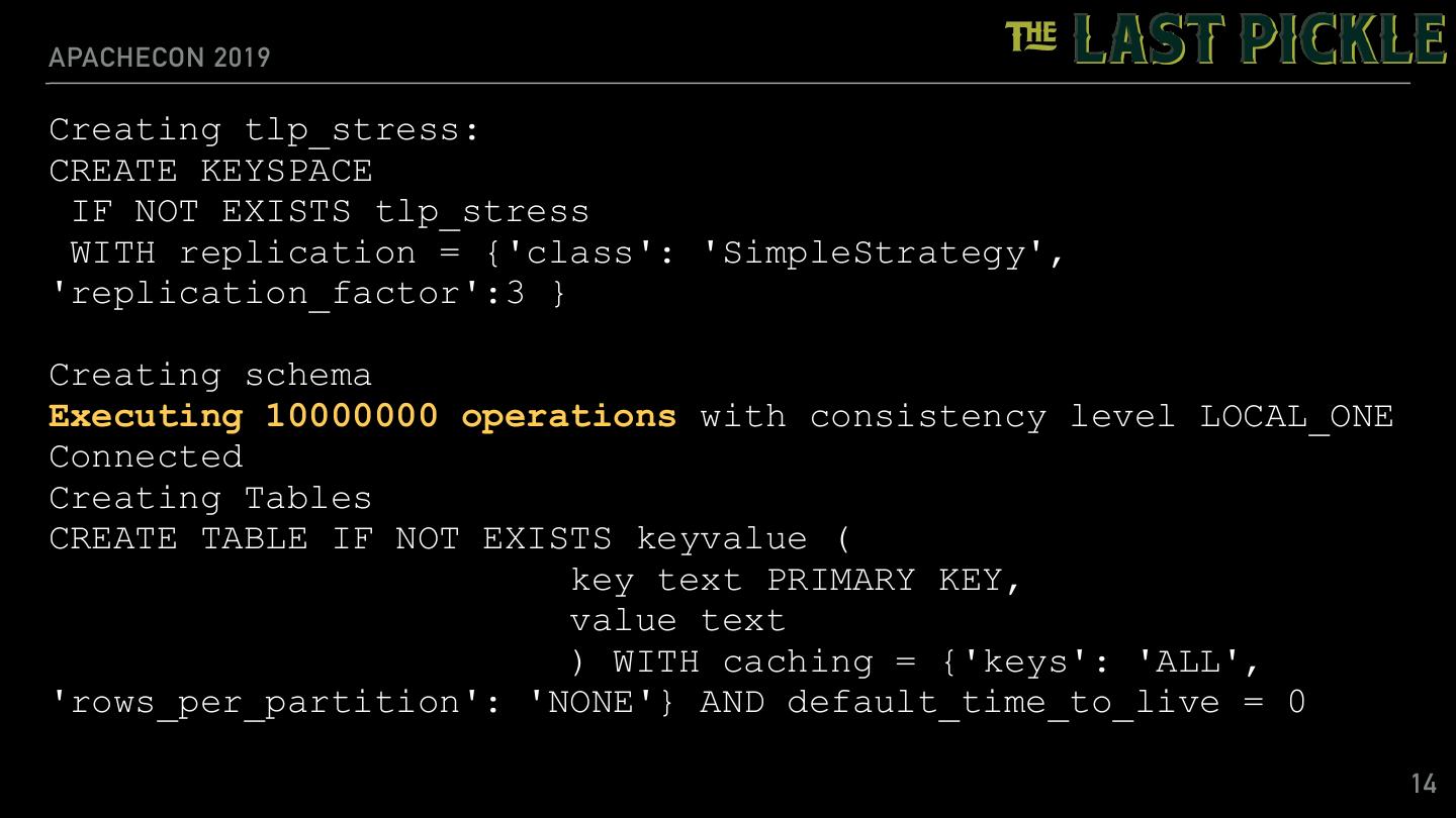 13 .APACHECON 2019 TLP-STRESS: KEY VALUE WORKLOAD EXAMPLE $ tlp-stress run KeyValue \ --reads 0.7 \ --partitions 100k \ --iterations 10M \ --populate 50k 13