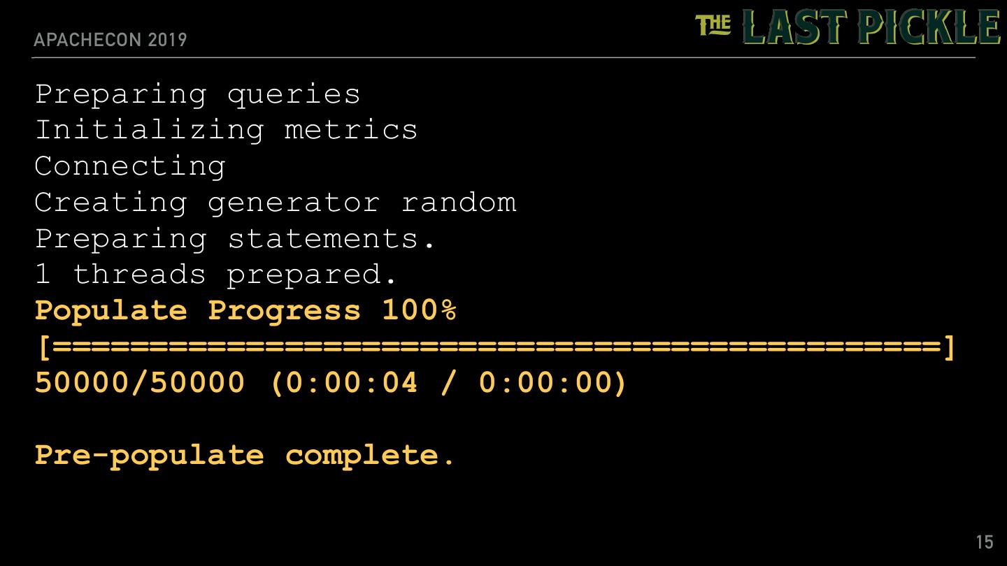 14 .APACHECON 2019 Creating tlp_stress: CREATE KEYSPACE IF NOT EXISTS tlp_stress WITH replication = {'class': 'SimpleStrategy', 'replication_factor':3 } Creating schema Executing 10000000 operations with consistency level LOCAL_ONE Connected Creating Tables CREATE TABLE IF NOT EXISTS keyvalue ( key text PRIMARY KEY, value text ) WITH caching = {'keys': 'ALL', 'rows_per_partition': 'NONE'} AND default_time_to_live = 0 14