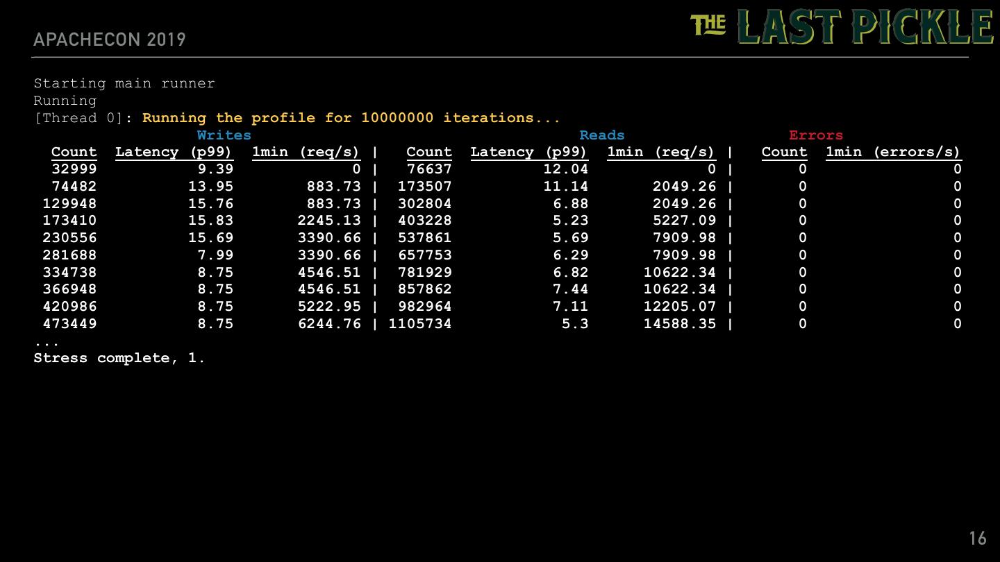 16 .APACHECON 2019 Starting main runner Running [Thread 0]: Running the profile for 10000000 iterations... Writes Reads Errors Count Latency (p99) 1min (req/s) | Count Latency (p99) 1min (req/s) | Count 1min (errors/s) 32999 9.39 0 | 76637 12.04 0 | 0 0 74482 13.95 883.73 | 173507 11.14 2049.26 | 0 0 129948 15.76 883.73 | 302804 6.88 2049.26 | 0 0 173410 15.83 2245.13 | 403228 5.23 5227.09 | 0 0 230556 15.69 3390.66 | 537861 5.69 7909.98 | 0 0 281688 7.99 3390.66 | 657753 6.29 7909.98 | 0 0 334738 8.75 4546.51 | 781929 6.82 10622.34 | 0 0 366948 8.75 4546.51 | 857862 7.44 10622.34 | 0 0 420986 8.75 5222.95 | 982964 7.11 12205.07 | 0 0 473449 8.75 6244.76 | 1105734 5.3 14588.35 | 0 0 ... Stress complete, 1. 16
