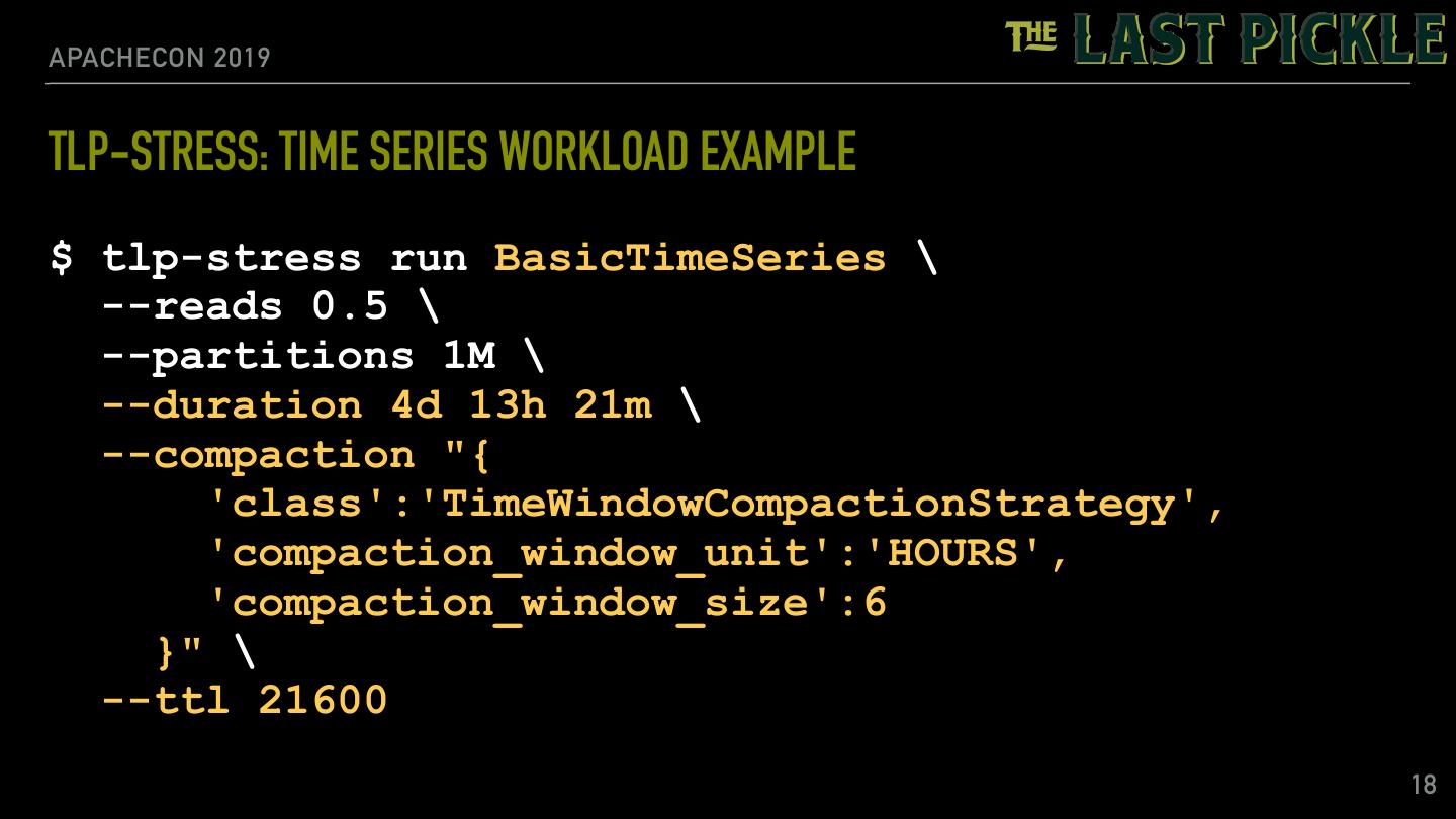 17 .APACHECON 2019 TLP-STRESS: TIME SERIES WORKLOAD EXAMPLE • BasicTimeSeries workload • 50% reads • 1,000,000 partitions • Run for 4 days, 13 hours, 21 minutes • TimeWindowCompactionStrategy • 6 hour TTL 17