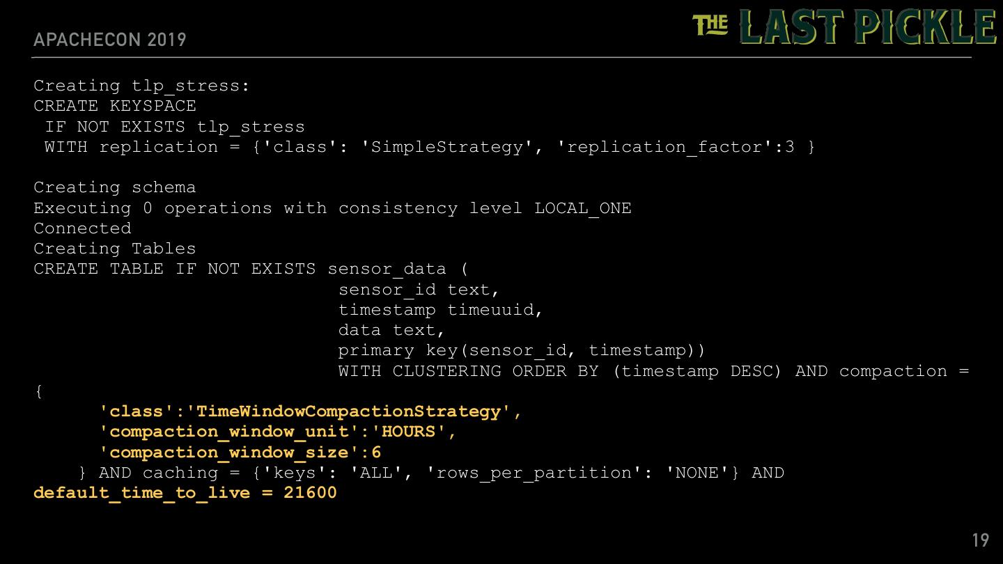 19 .APACHECON 2019 Creating tlp_stress: CREATE KEYSPACE IF NOT EXISTS tlp_stress WITH replication = {'class': 'SimpleStrategy', 'replication_factor':3 } Creating schema Executing 0 operations with consistency level LOCAL_ONE Connected Creating Tables CREATE TABLE IF NOT EXISTS sensor_data ( sensor_id text, timestamp timeuuid, data text, primary key(sensor_id, timestamp)) WITH CLUSTERING ORDER BY (timestamp DESC) AND compaction = { 'class':'TimeWindowCompactionStrategy', 'compaction_window_unit':'HOURS', 'compaction_window_size':6 } AND caching = {'keys': 'ALL', 'rows_per_partition': 'NONE'} AND default_time_to_live = 21600 19