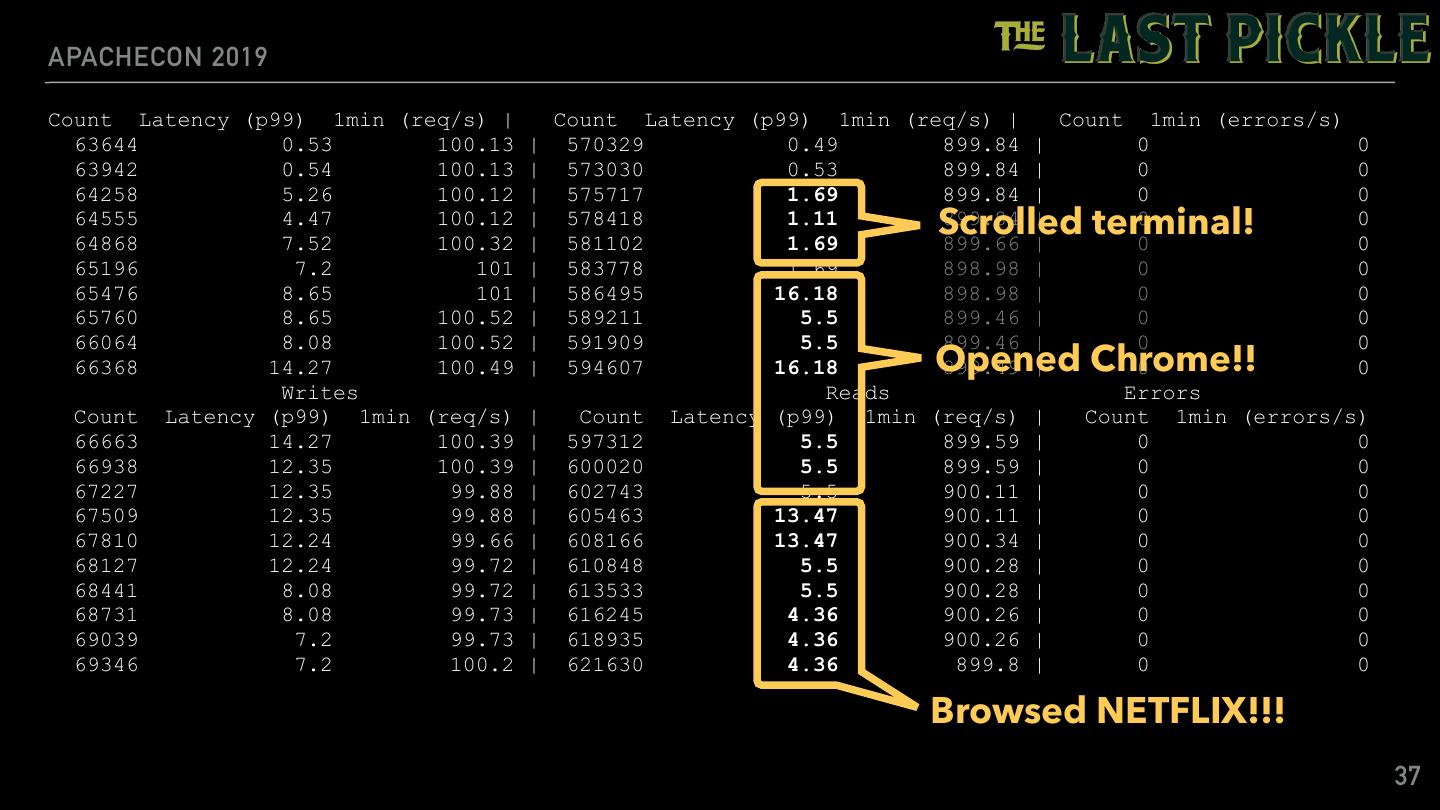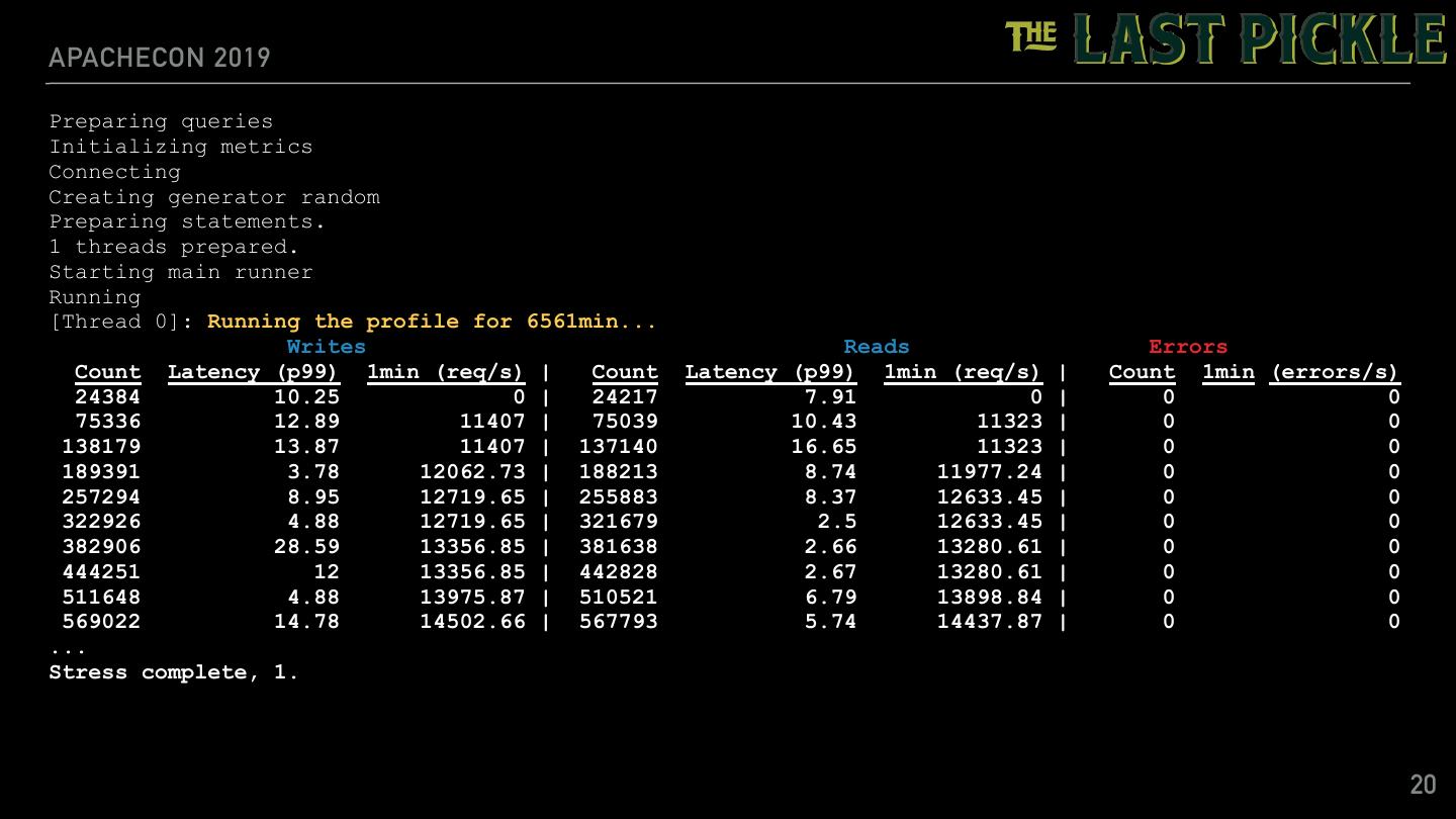 20 .APACHECON 2019 Preparing queries Initializing metrics Connecting Creating generator random Preparing statements. 1 threads prepared. Starting main runner Running [Thread 0]: Running the profile for 6561min... Writes Reads Errors Count Latency (p99) 1min (req/s) | Count Latency (p99) 1min (req/s) | Count 1min (errors/s) 24384 10.25 0 | 24217 7.91 0 | 0 0 75336 12.89 11407 | 75039 10.43 11323 | 0 0 138179 13.87 11407 | 137140 16.65 11323 | 0 0 189391 3.78 12062.73 | 188213 8.74 11977.24 | 0 0 257294 8.95 12719.65 | 255883 8.37 12633.45 | 0 0 322926 4.88 12719.65 | 321679 2.5 12633.45 | 0 0 382906 28.59 13356.85 | 381638 2.66 13280.61 | 0 0 444251 12 13356.85 | 442828 2.67 13280.61 | 0 0 511648 4.88 13975.87 | 510521 6.79 13898.84 | 0 0 569022 14.78 14502.66 | 567793 5.74 14437.87 | 0 0 ... Stress complete, 1. 20