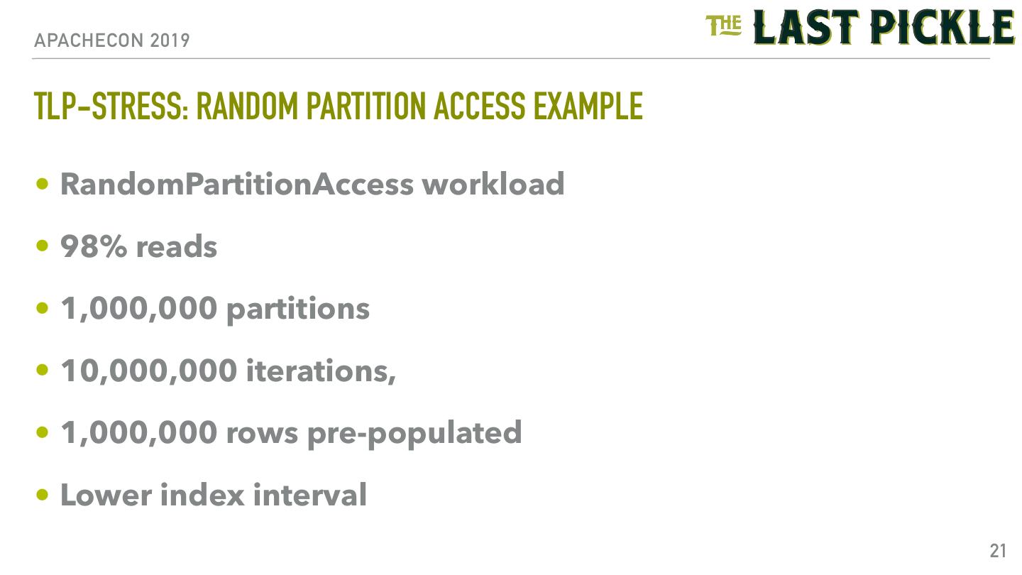 21 .APACHECON 2019 TLP-STRESS: RANDOM PARTITION ACCESS EXAMPLE • RandomPartitionAccess workload • 98% reads • 1,000,000 partitions • 10,000,000 iterations, • 1,000,000 rows pre-populated • Lower index interval 21