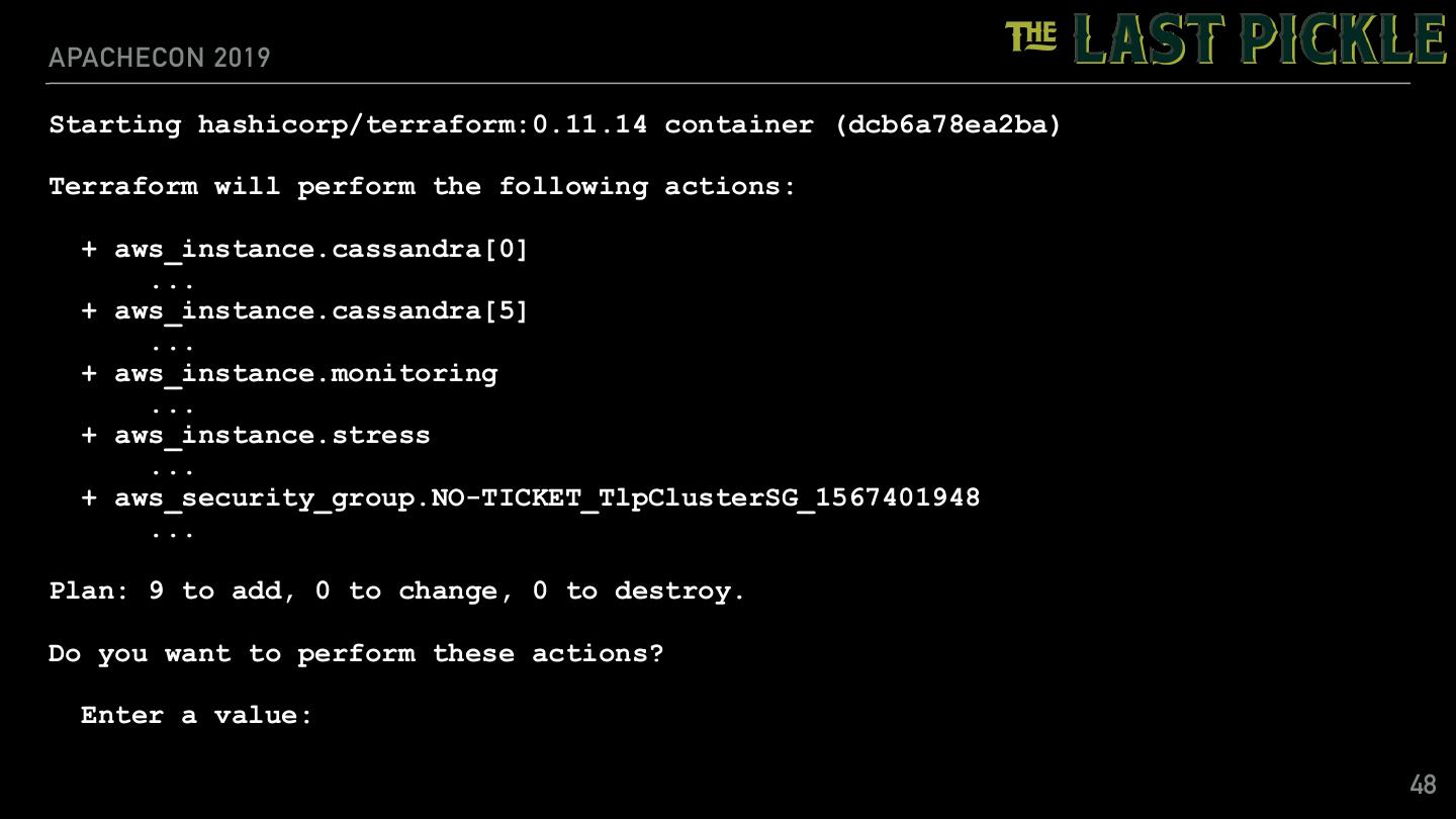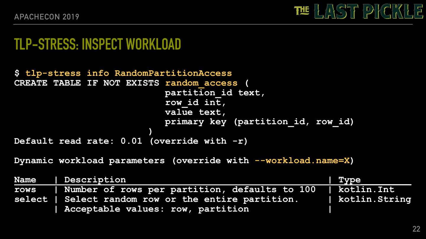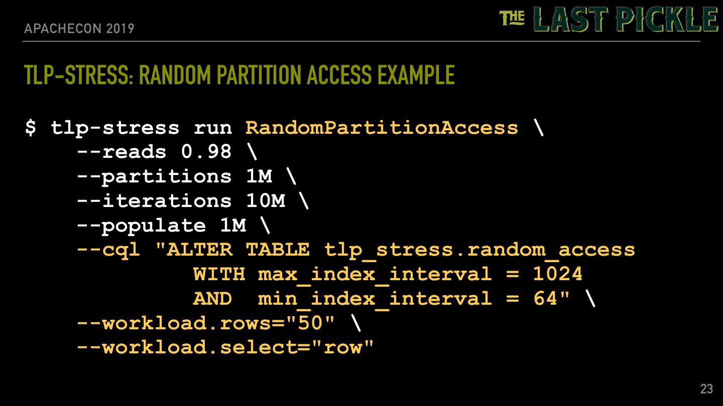 22 .APACHECON 2019 TLP-STRESS: INSPECT WORKLOAD $ tlp-stress info RandomPartitionAccess CREATE TABLE IF NOT EXISTS random_access ( partition_id text, row_id int, value text, primary key (partition_id, row_id) ) Default read rate: 0.01 (override with -r) Dynamic workload parameters (override with --workload.name=X) Name | Description | Type_________ rows | Number of rows per partition, defaults to 100 | kotlin.Int select | Select random row or the entire partition. | kotlin.String | Acceptable values: row, partition | 22