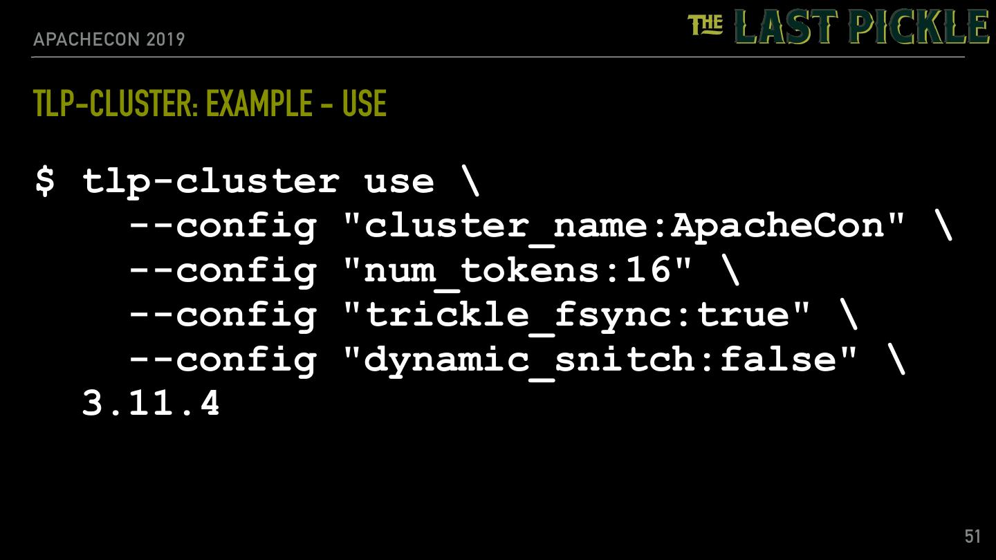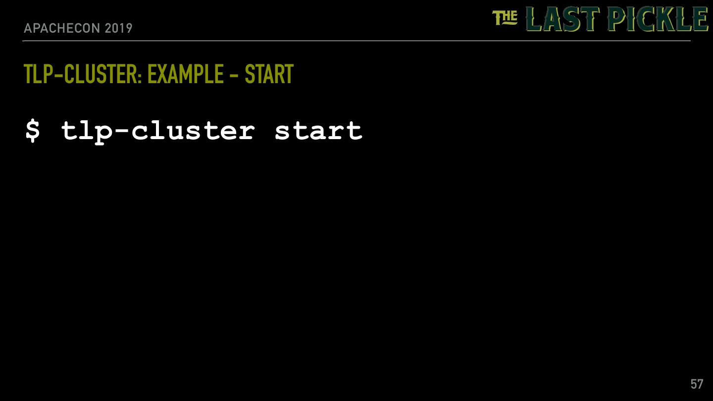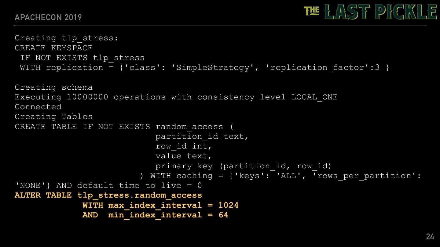23 .APACHECON 2019 TLP-STRESS: RANDOM PARTITION ACCESS EXAMPLE $ tlp-stress run RandomPartitionAccess \ --reads 0.98 \ --partitions 1M \ --iterations 10M \ --populate 1M \ --cql "ALTER TABLE tlp_stress.random_access WITH max_index_interval = 1024 AND min_index_interval = 64" \ --workload.rows="50" \ --workload.select="row" 23