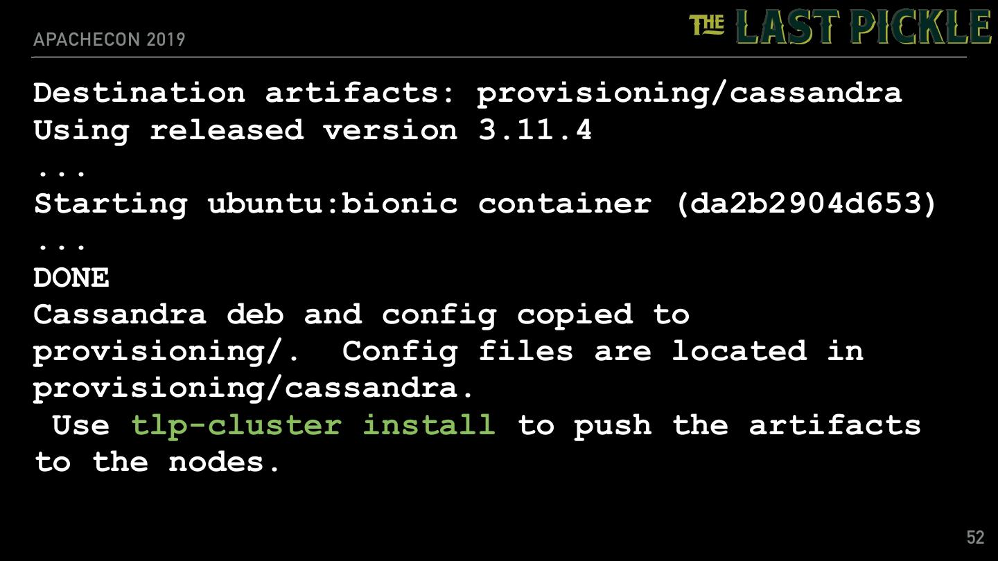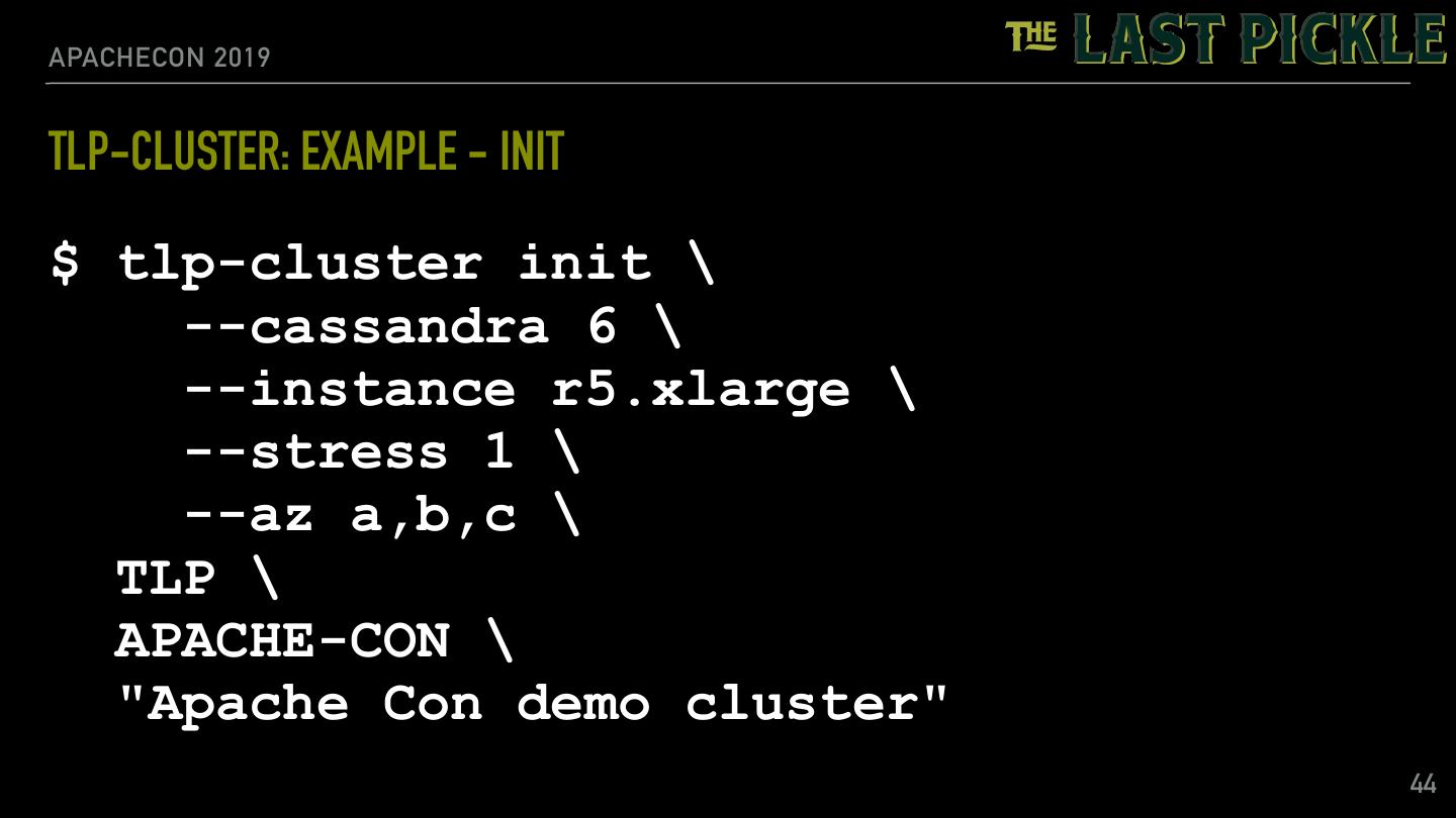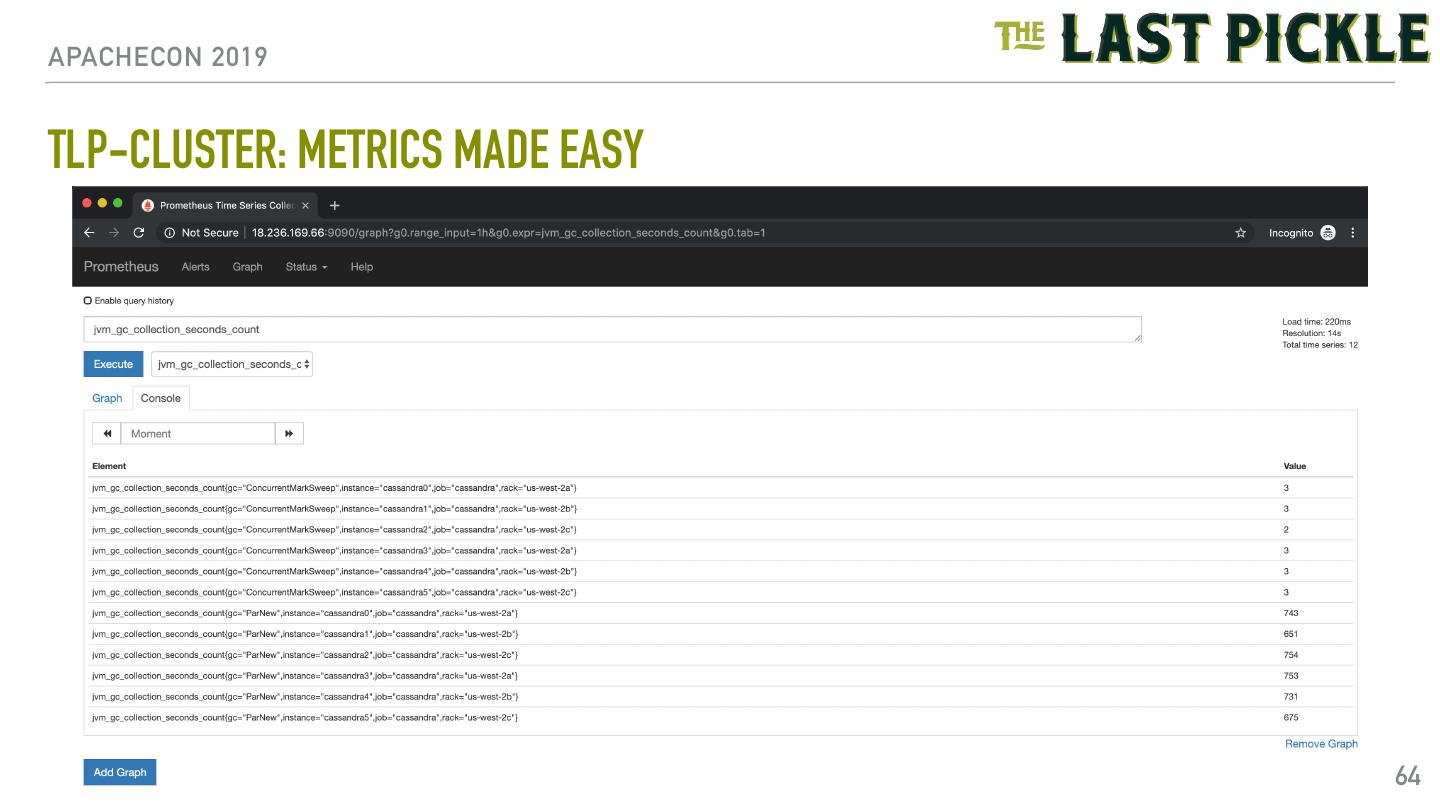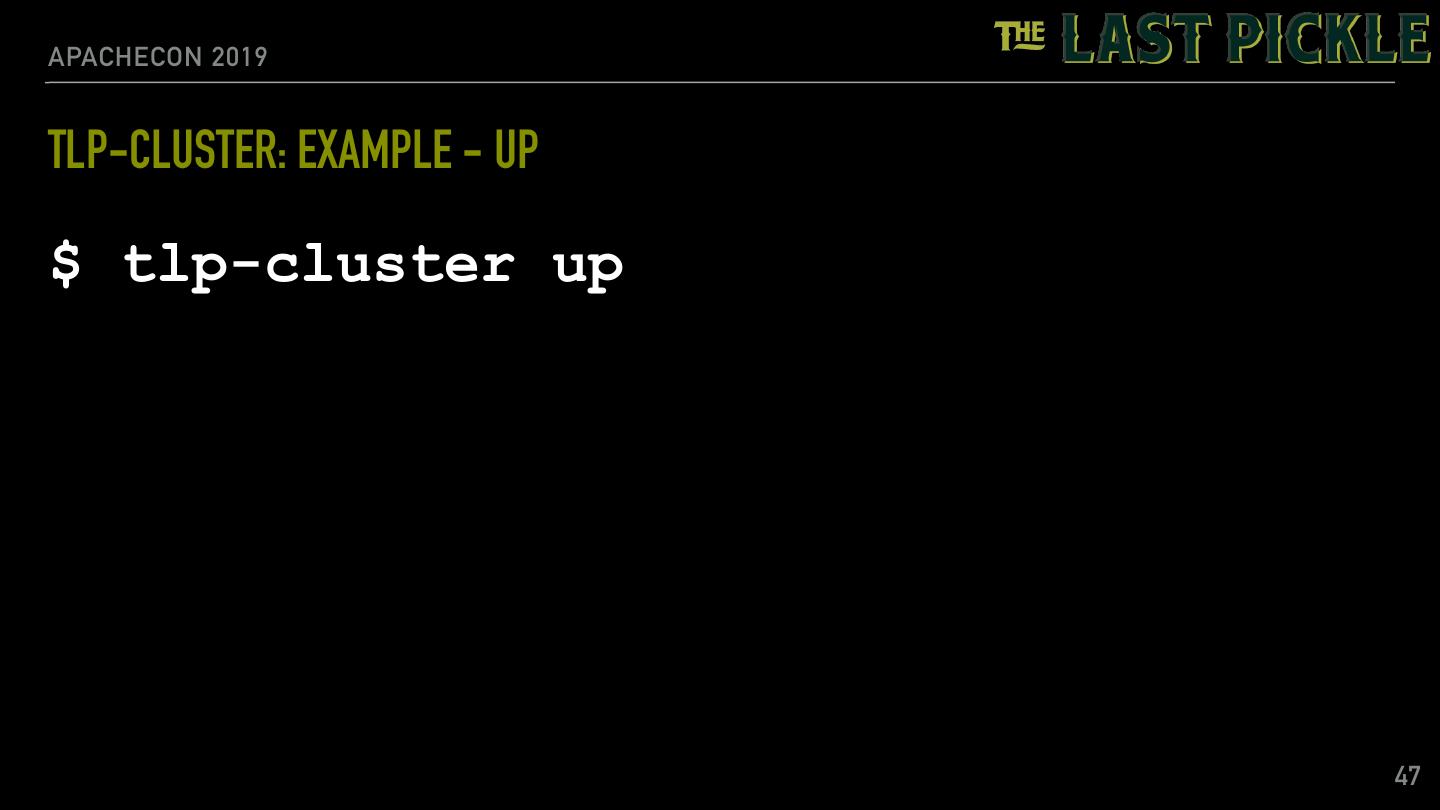 23 .APACHECON 2019 TLP-STRESS: RANDOM PARTITION ACCESS EXAMPLE $ tlp-stress run RandomPartitionAccess \ --reads 0.98 \ --partitions 1M \ --iterations 10M \ --populate 1M \ --cql "ALTER TABLE tlp_stress.random_access WITH max_index_interval = 1024 AND min_index_interval = 64" \ --workload.rows="50" \ --workload.select="row" 23