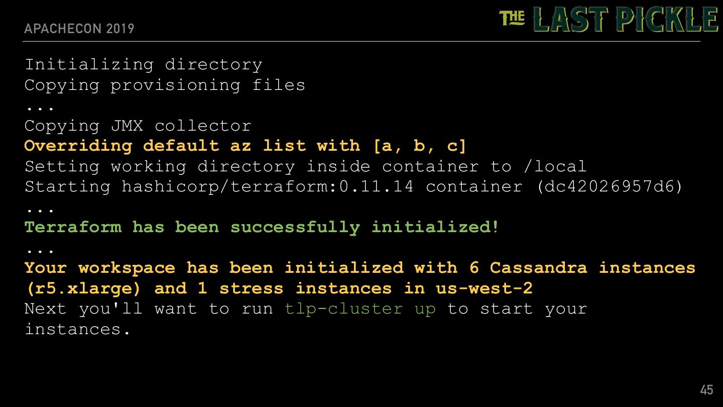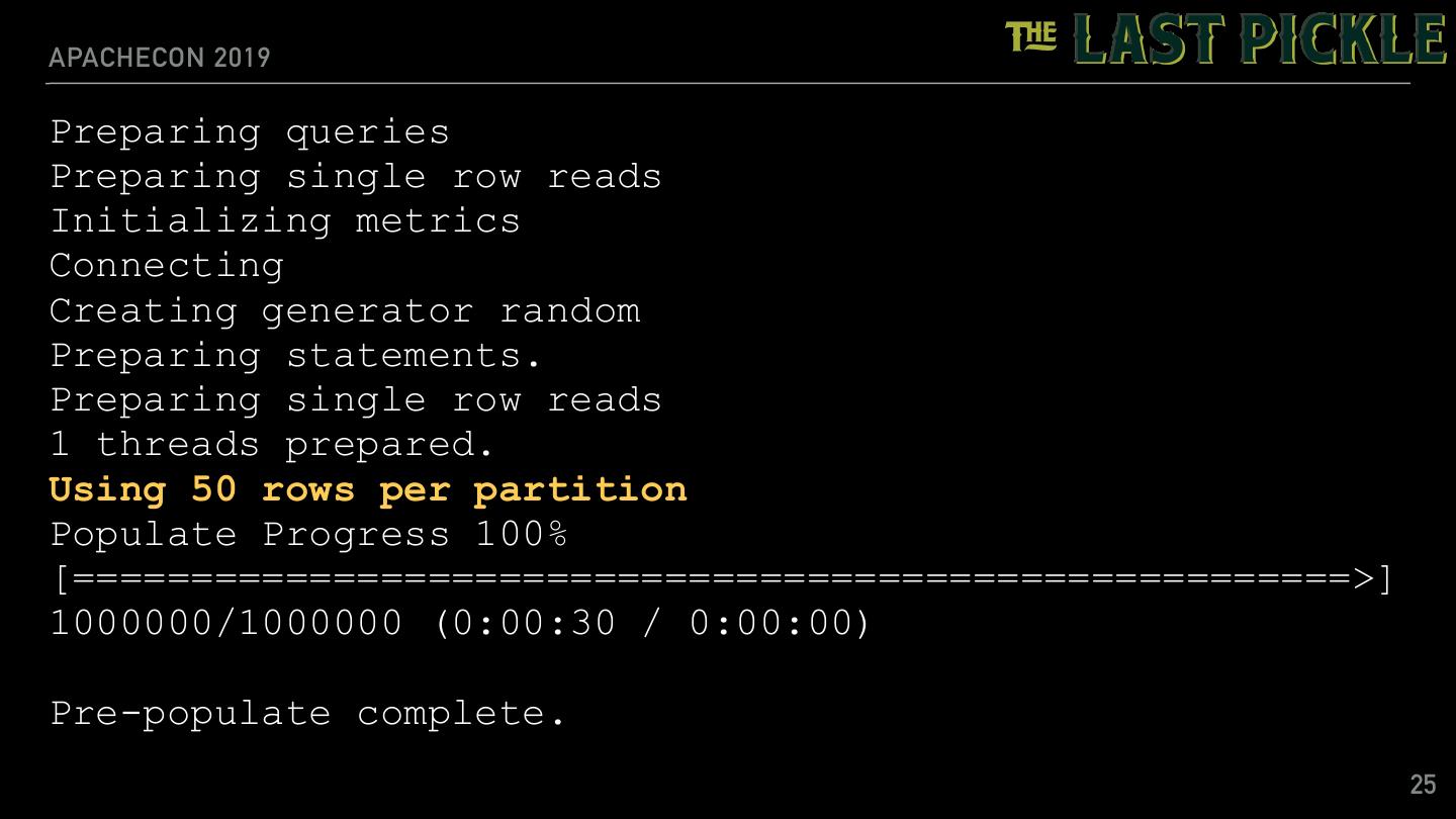 24 .APACHECON 2019 Creating tlp_stress: CREATE KEYSPACE IF NOT EXISTS tlp_stress WITH replication = {'class': 'SimpleStrategy', 'replication_factor':3 } Creating schema Executing 10000000 operations with consistency level LOCAL_ONE Connected Creating Tables CREATE TABLE IF NOT EXISTS random_access ( partition_id text, row_id int, value text, primary key (partition_id, row_id) ) WITH caching = {'keys': 'ALL', 'rows_per_partition': 'NONE'} AND default_time_to_live = 0 ALTER TABLE tlp_stress.random_access WITH max_index_interval = 1024 AND min_index_interval = 64 24