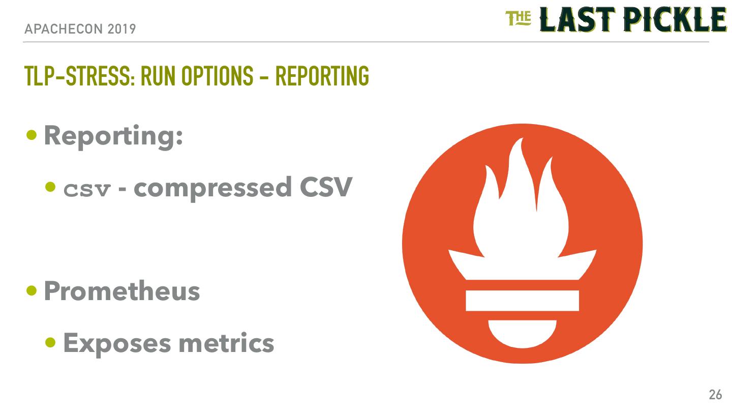 26 .APACHECON 2019 TLP-STRESS: RUN OPTIONS - REPORTING • Reporting: • csv - compressed CSV • Prometheus • Exposes metrics 26