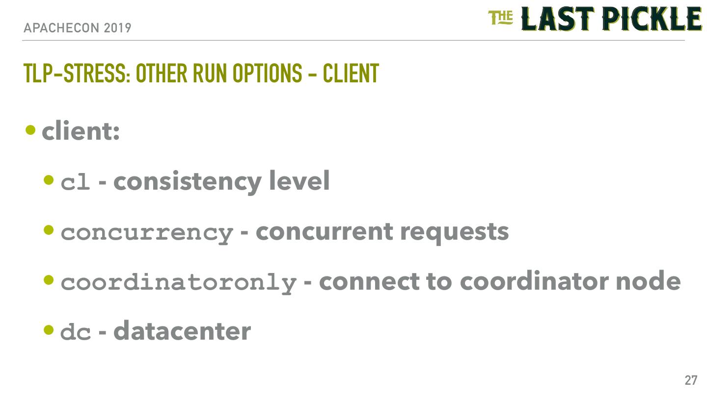 27 .APACHECON 2019 TLP-STRESS: OTHER RUN OPTIONS - CLIENT • client: • cl - consistency level • concurrency - concurrent requests • coordinatoronly - connect to coordinator node • dc - datacenter 27