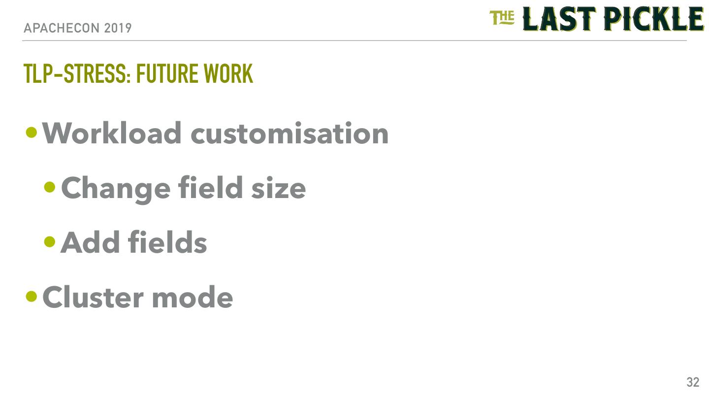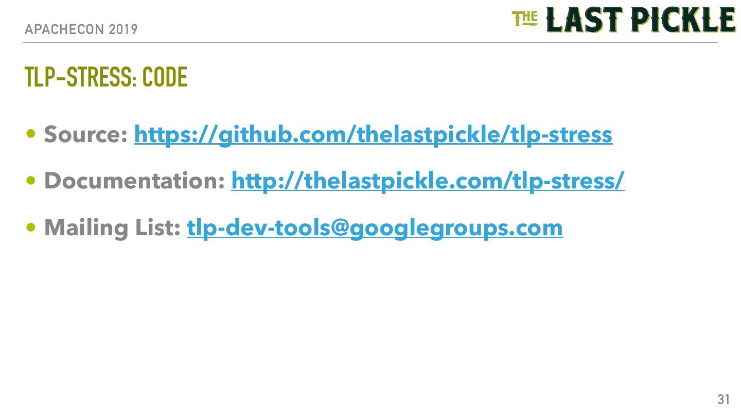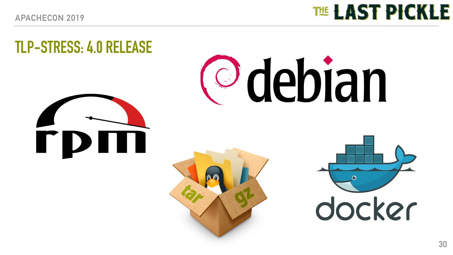 29 .APACHECON 2019 TLP-STRESS: OTHER RUN OPTIONS - WORKLOAD • workload: • partitiongenerator - partition generation method • random, sequential, gaussian • rate - rate limiter 29