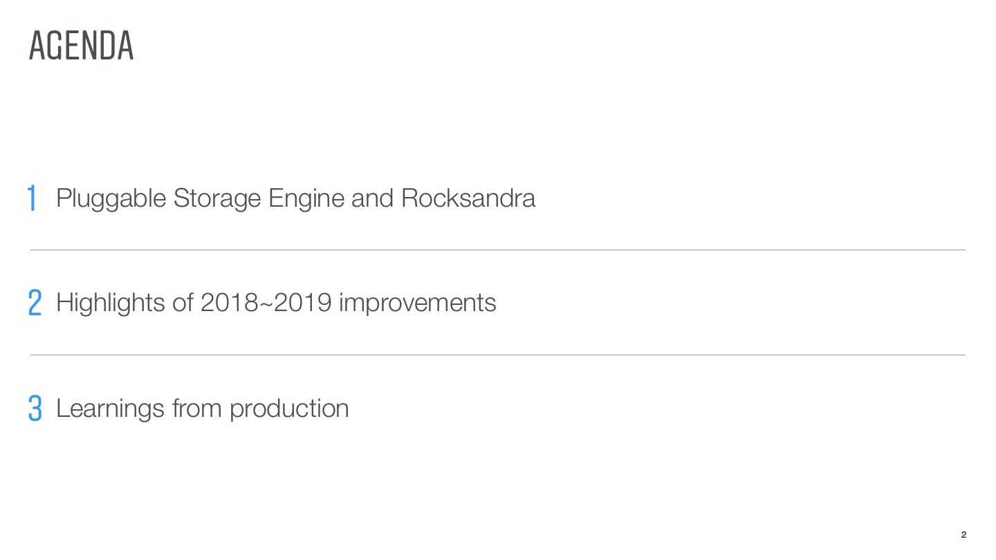 2 .AGENDA 1 Pluggable Storage Engine and Rocksandra 2 Highlights of 2018~2019 improvements 3 Learnings from production 2