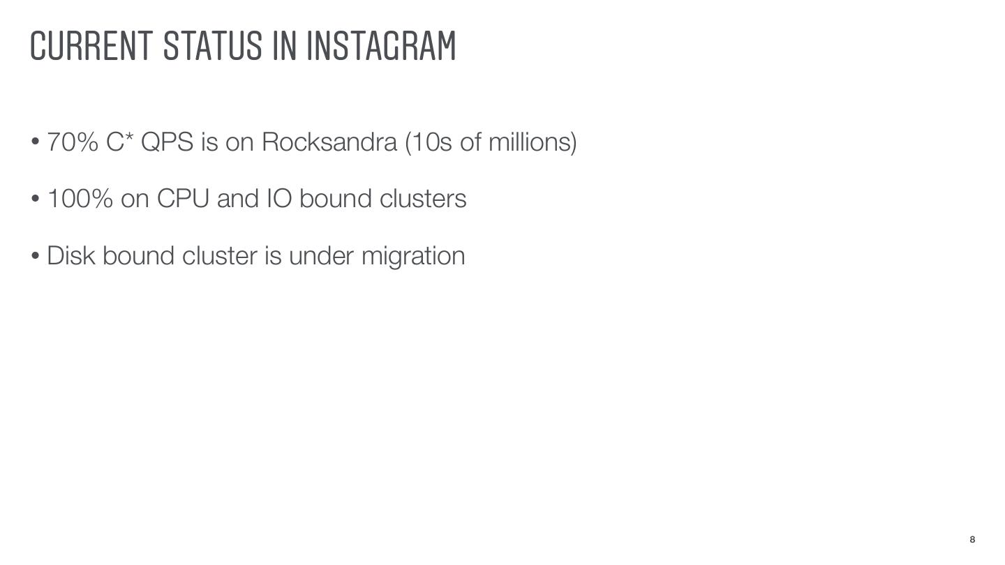 8 .CURRENT STATUS IN INSTAGRAM • 70% C* QPS is on Rocksandra (10s of millions) • 100% on CPU and IO bound clusters • Disk bound cluster is under migration 8