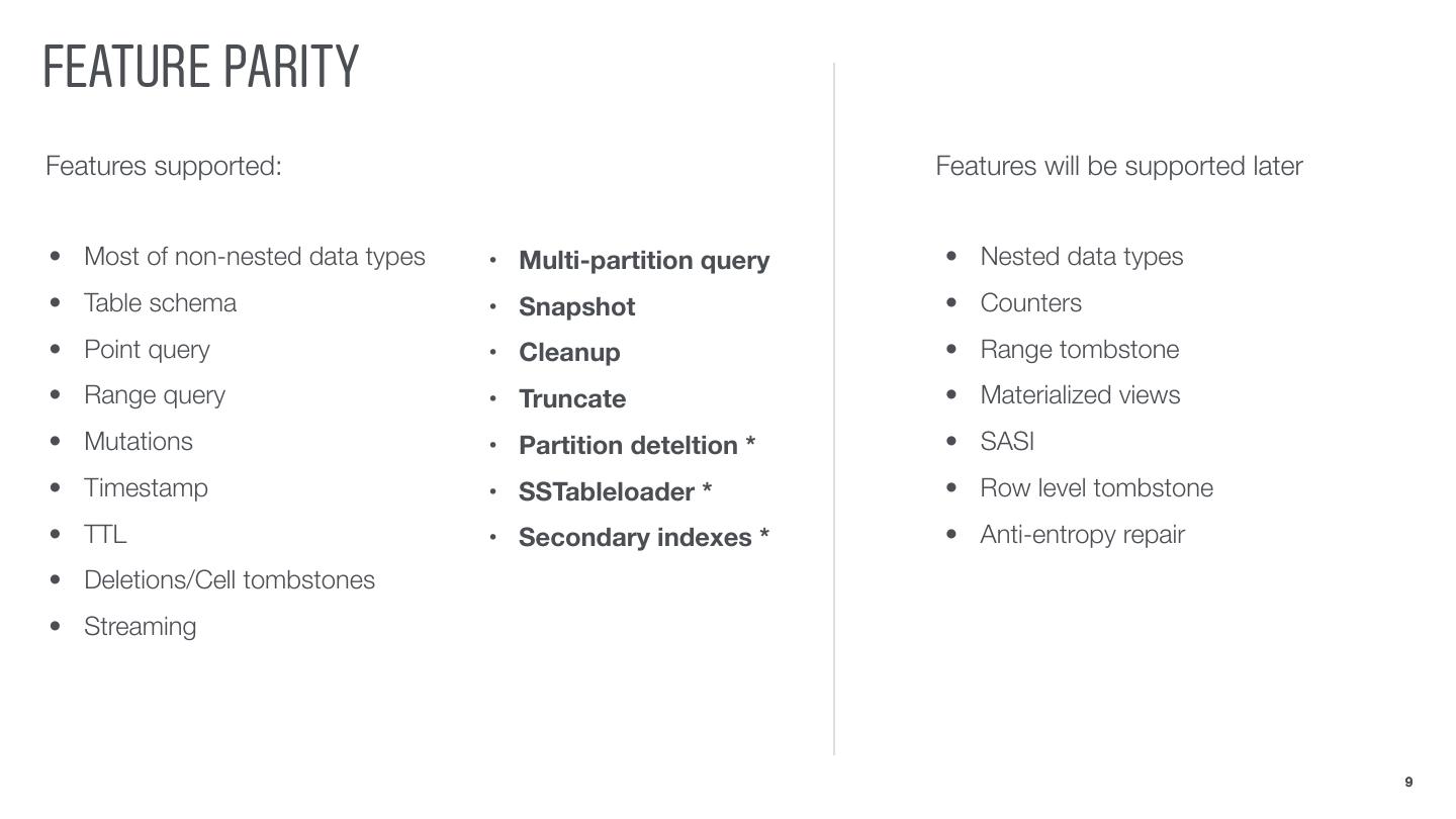 9 .FEATURE PARITY Features supported: Features will be supported later • Most of non-nested data types • Multi-partition query • Nested data types • Table schema • Snapshot • Counters • Point query • Cleanup • Range tombstone • Range query • Truncate • Materialized views • Mutations • Partition deteltion * • SASI • Timestamp • SSTableloader * • Row level tombstone • TTL • Secondary indexes * • Anti-entropy repair • Deletions/Cell tombstones • Streaming 9