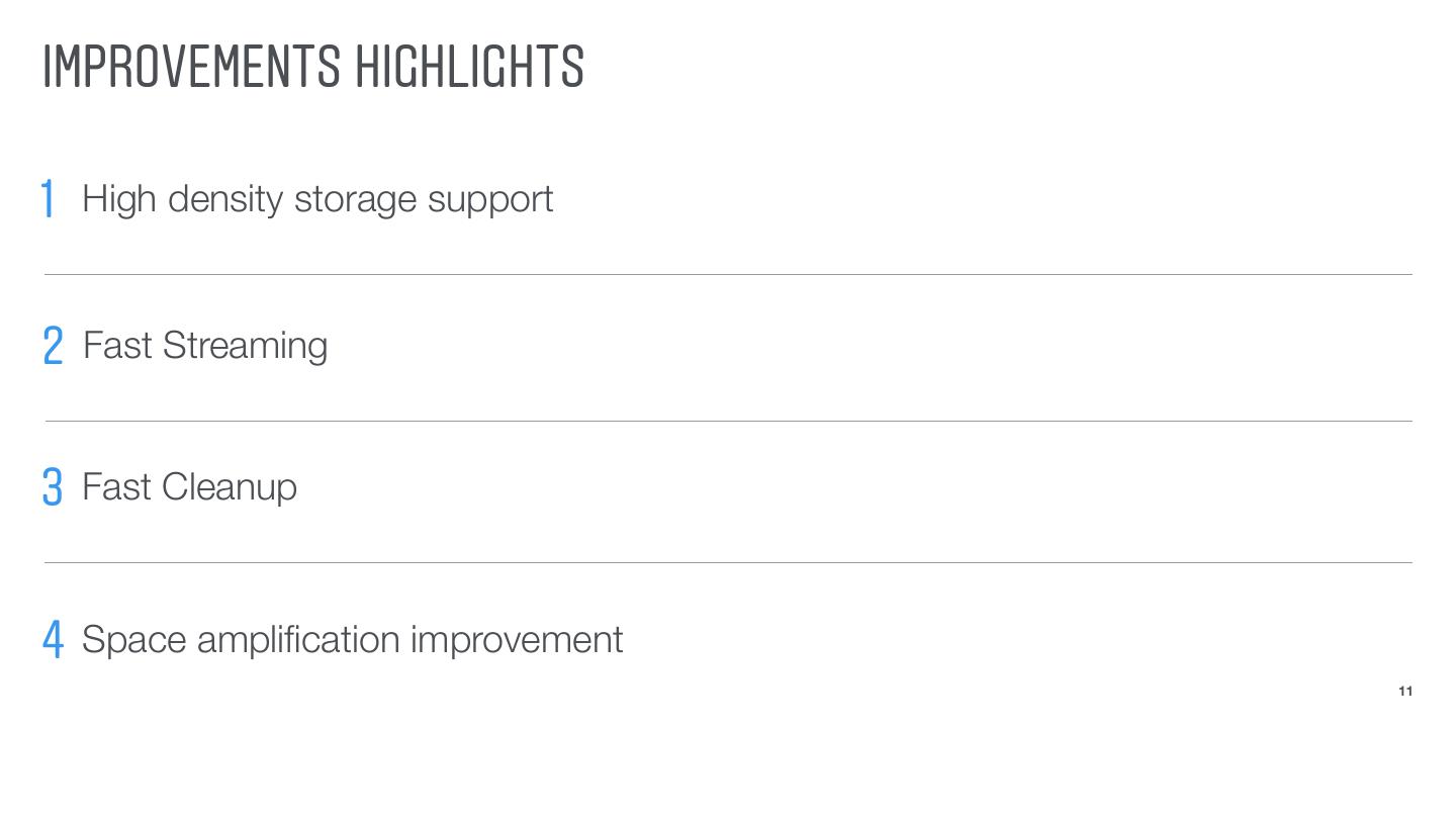 11 .IMPROVEMENTS HIGHLIGHTS 1 High density storage support 2 Fast Streaming 3 Fast Cleanup 4 Space amplification improvement 11