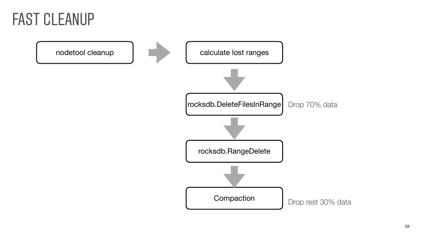 22 .FAST CLEANUP nodetool cleanup calculate lost ranges rocksdb.DeleteFilesInRange Drop 70% data rocksdb.RangeDelete Compaction Drop rest 30% data 22