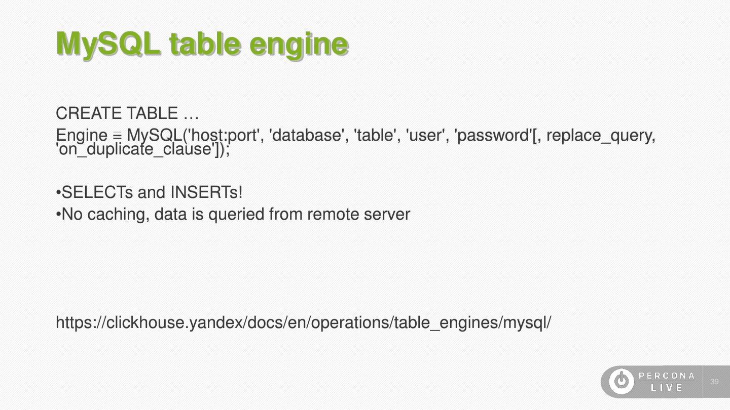 29 .What’s new in 2018 • Table functions mysql/odbc/file/http • clickhouse-copier • Predicate pushdown for views/subselects • LowCardinality datatype • Decimal datatype • JOIN enhancements • ALTER TABLE UPDATE/DELETE • WITH ROLLUP … and tons of performance improvements and small features 30