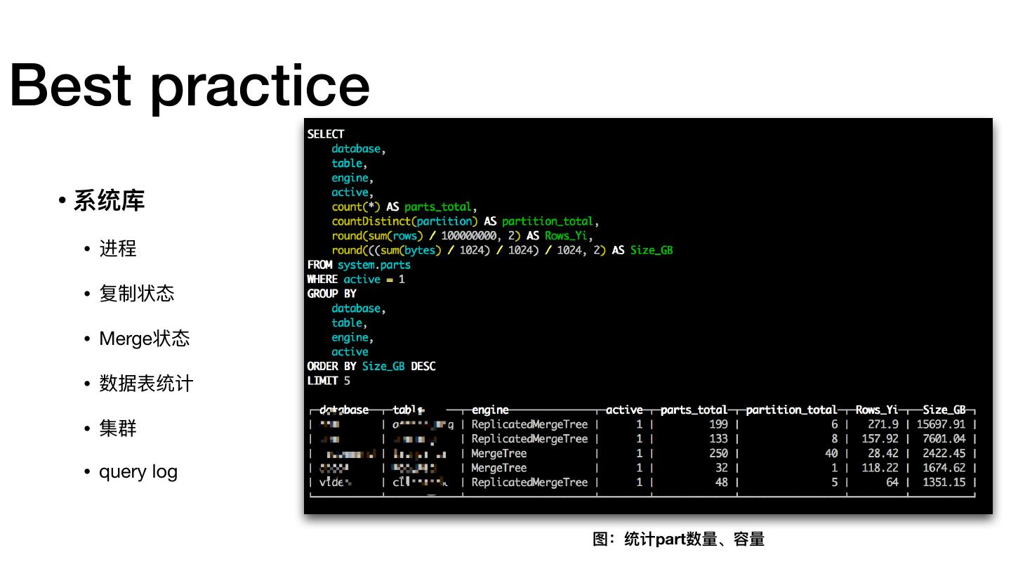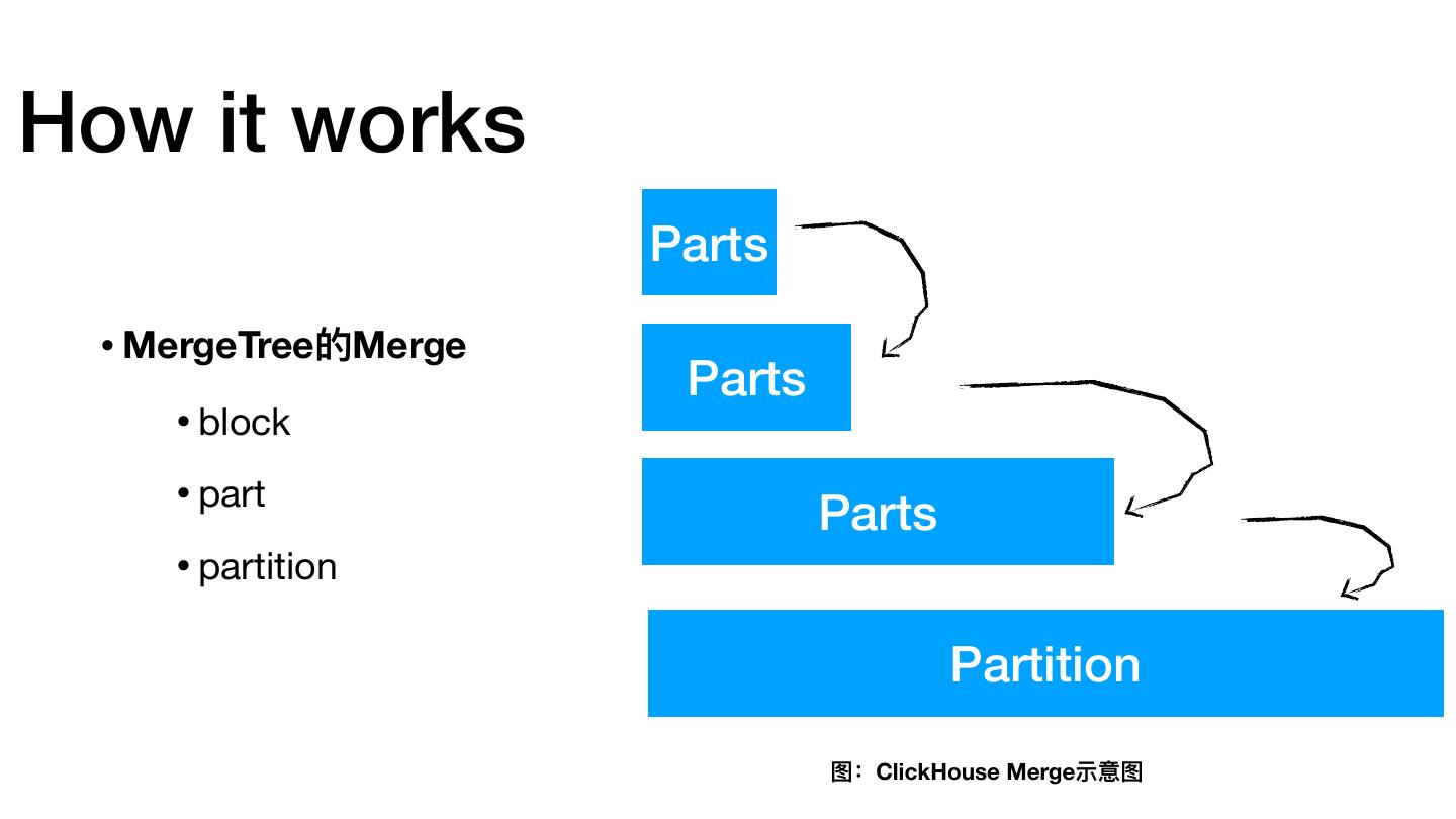 25 .How it works Parts • MergeTree的Merge Parts • block • part Parts • partition Partition 图:ClickHouse Merge示意图