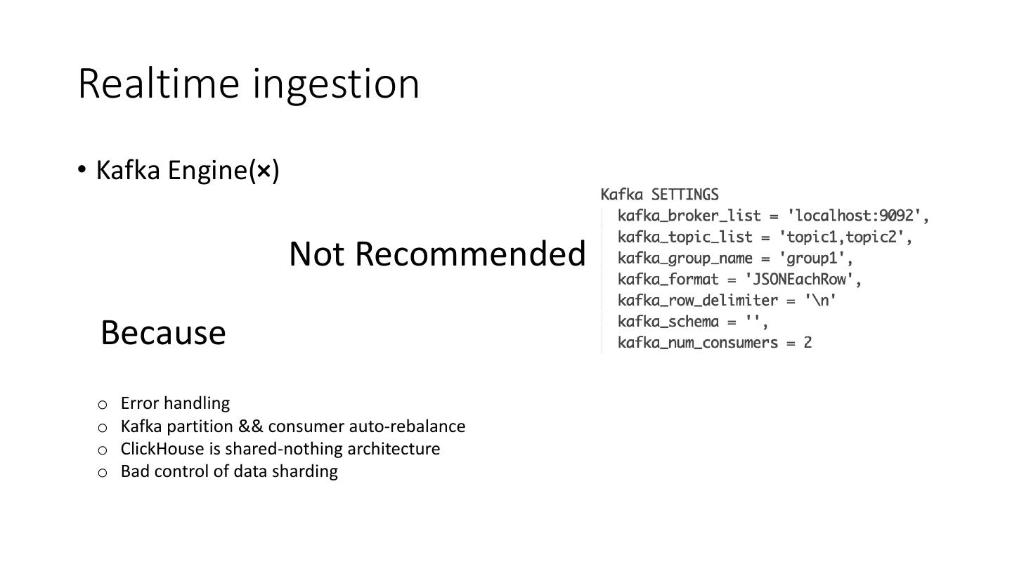 8 .Realtime ingestion • Kafka Engine(×) Not Recommended Because o Error handling o Kafka partition && consumer auto-rebalance o ClickHouse is shared-nothing architecture o Bad control of data sharding