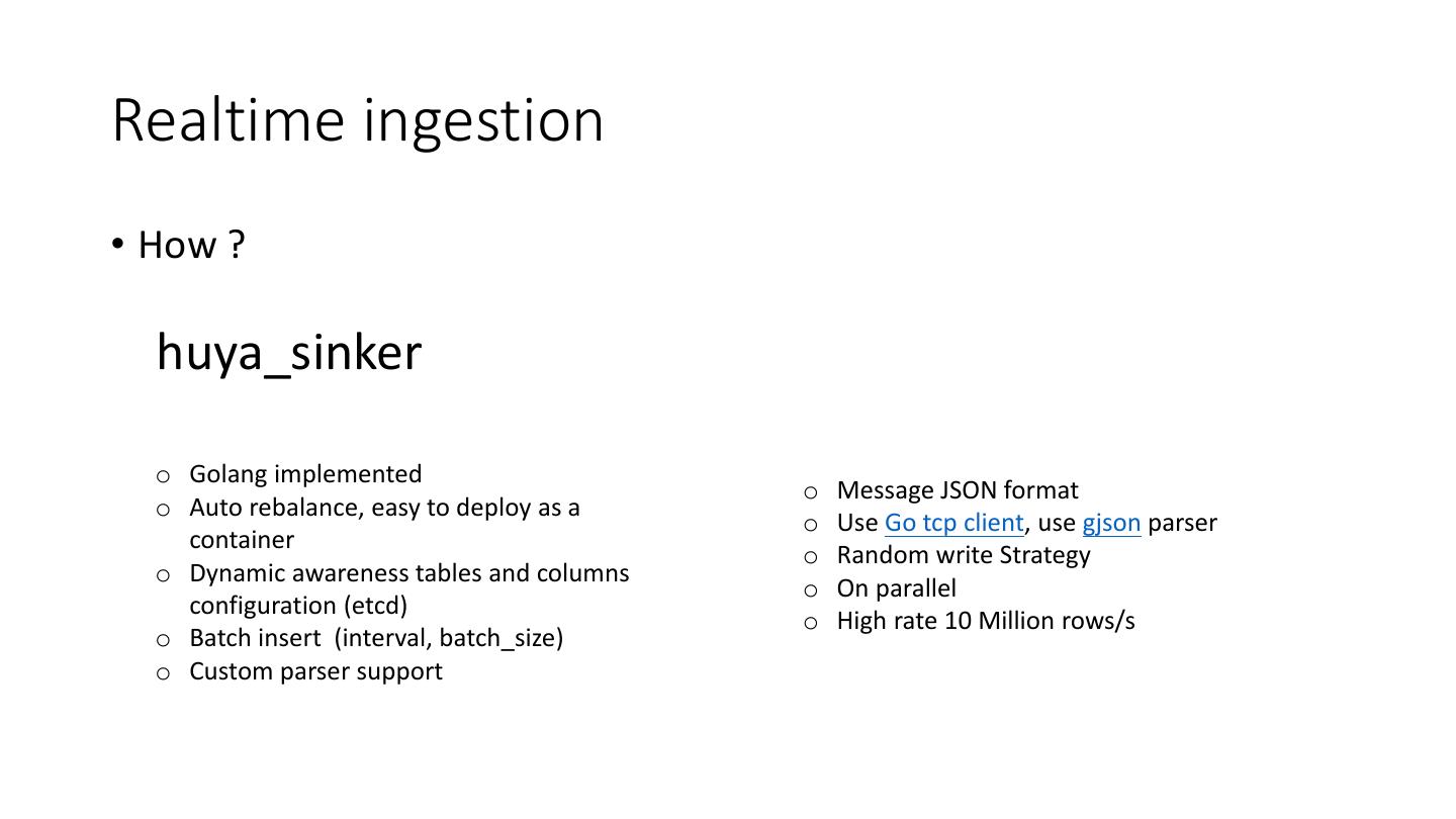 9 .Realtime ingestion • How ? huya_sinker o Golang implemented o Message JSON format o Auto rebalance, easy to deploy as a o Use Go tcp client, use gjson parser container o Random write Strategy o Dynamic awareness tables and columns o On parallel configuration (etcd) o High rate 10 Million rows/s o Batch insert (interval, batch_size) o Custom parser support