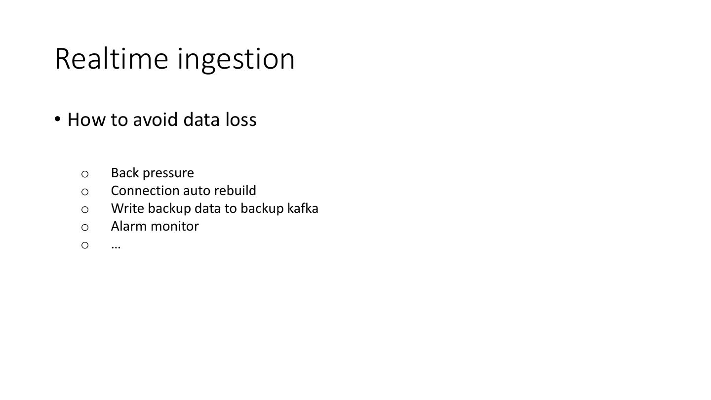 10 .Realtime ingestion • How to avoid data loss o Back pressure o Connection auto rebuild o Write backup data to backup kafka o Alarm monitor o …
