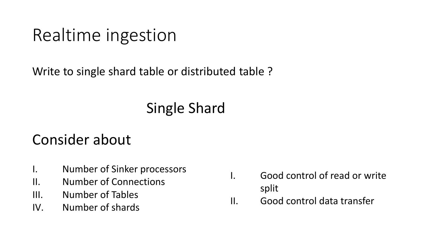 11 .Realtime ingestion Write to single shard table or distributed table ? Single Shard Consider about I. Number of Sinker processors I. Good control of read or write II. Number of Connections split III. Number of Tables II. Good control data transfer IV. Number of shards