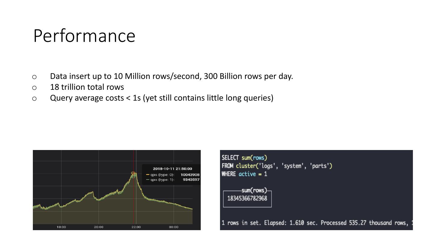 22 .Performance o Data insert up to 10 Million rows/second, 300 Billion rows per day. o 18 trillion total rows o Query average costs < 1s (yet still contains little long queries)