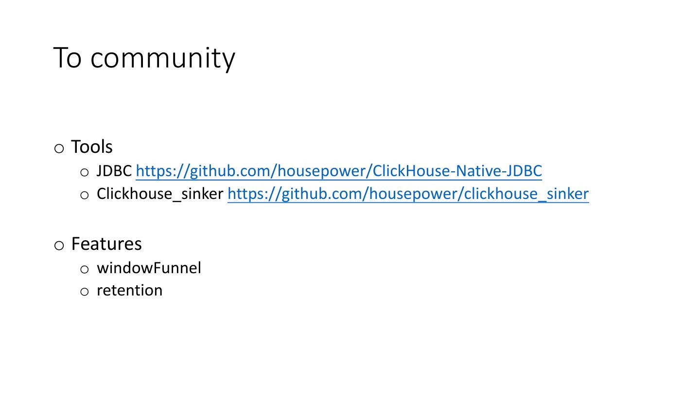 23 .To community o Tools o JDBC https://github.com/housepower/ClickHouse-Native-JDBC o Clickhouse_sinker https://github.com/housepower/clickhouse_sinker o Features o windowFunnel o retention