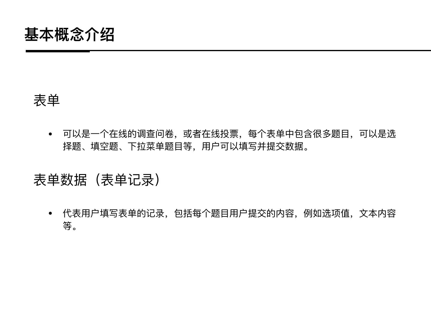 4 .基本概念介绍 表单 • 可以是⼀一个在线的调查问卷,或者在线投票,每个表单中包含很多题⽬目,可以是选 择题、填空题、下拉菜单题⽬目等,⽤用户可以填写并提交数据。 表单数据(表单记录) • 代表⽤用户填写表单的记录,包括每个题⽬目⽤用户提交的内容,例例如选项值,⽂文本内容 等。