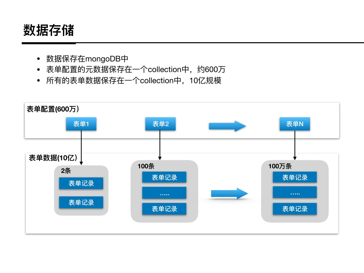 6 .数据存储 • 数据保存在mongoDB中 • 表单配置的元数据保存在⼀一个collection中,约600万 • 所有的表单数据保存在⼀一个collection中,10亿规模 表单配置(600万) 表单1 表单2 表单N 表单数据(10亿) 100条 100万条 2条 表单记录 表单记录 表单记录 ….. ….. 表单记录 表单记录 表单记录