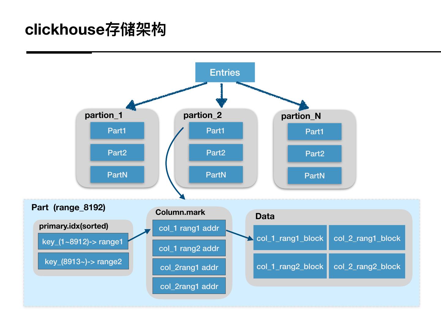 13 .clickhouse存储架构 Entries partion_1 partion_2 partion_N Part1 Part1 Part1 Part2 Part2 Part2 PartN PartN PartN Part (range_8192) Column.mark Data primary.idx(sorted) col_1 rang1 addr key_(1~8912)-> range1 col_1_rang1_block col_2_rang1_block col_1 rang2 addr key_(8913~)-> range2 col_2rang1 addr col_1_rang2_block col_2_rang2_block col_2rang1 addr