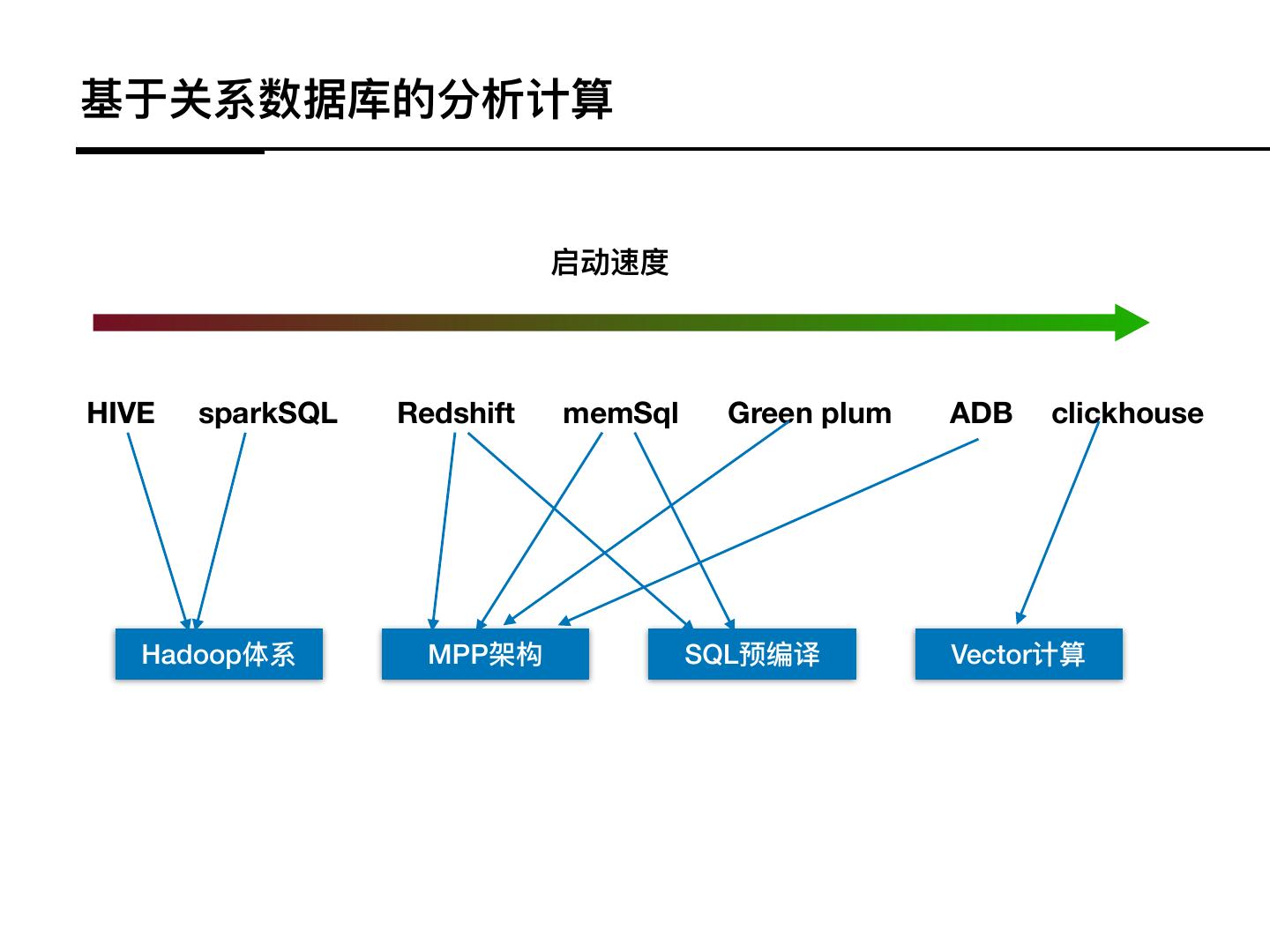 14 .基于关系数据库的分析计算 启动速度 HIVE sparkSQL Redshift memSql Green plum ADB clickhouse Hadoop体系 MPP架构 SQL预编译 Vector计算