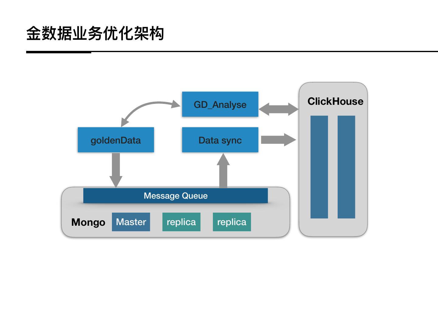17 .⾦金金数据业务优化架构 GD_Analyse ClickHouse goldenData Data sync Message Queue Mongo Master replica replica