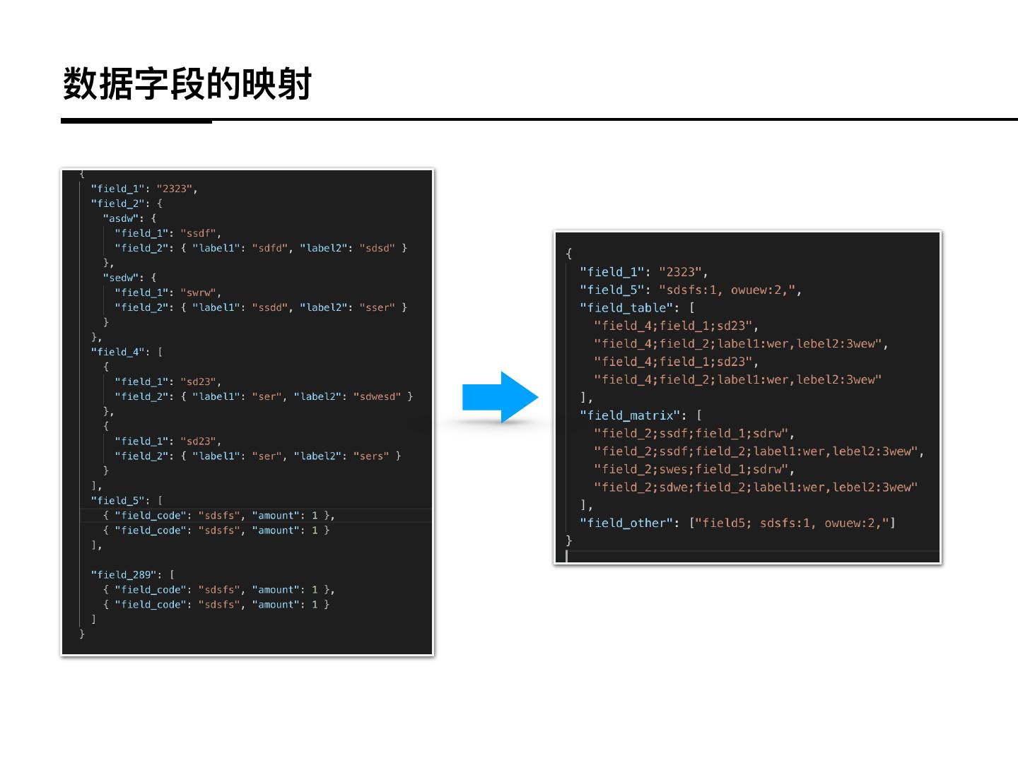 5 .数据格式详解 • ⽬目前表单包括字段类型约30种,后续可能还会增加。 • 其中有些字段类型是组合类字段,可以由多个其他类型组合。 • 每个表单包含字段个数不不限制,同⼀一个字段类型的个数也不不限制。 表单 表单数据 单选 “ASER” 多级下拉框 {label_1: “SEWS”,label_2: “DSES”} 地址 {provice: “陕⻄西”,city: “⻄西安”, street:”科技路路 ”} 关联⼦子段 “129283103983103812038192” … [{field_1: “SEWA’, field_2: {label_1: “SEWS”, 表格 label_2: “DSES”}, {field_1: “SEWA’,field_2: {label_1:“SEWS”, label_2: “DSES”}]