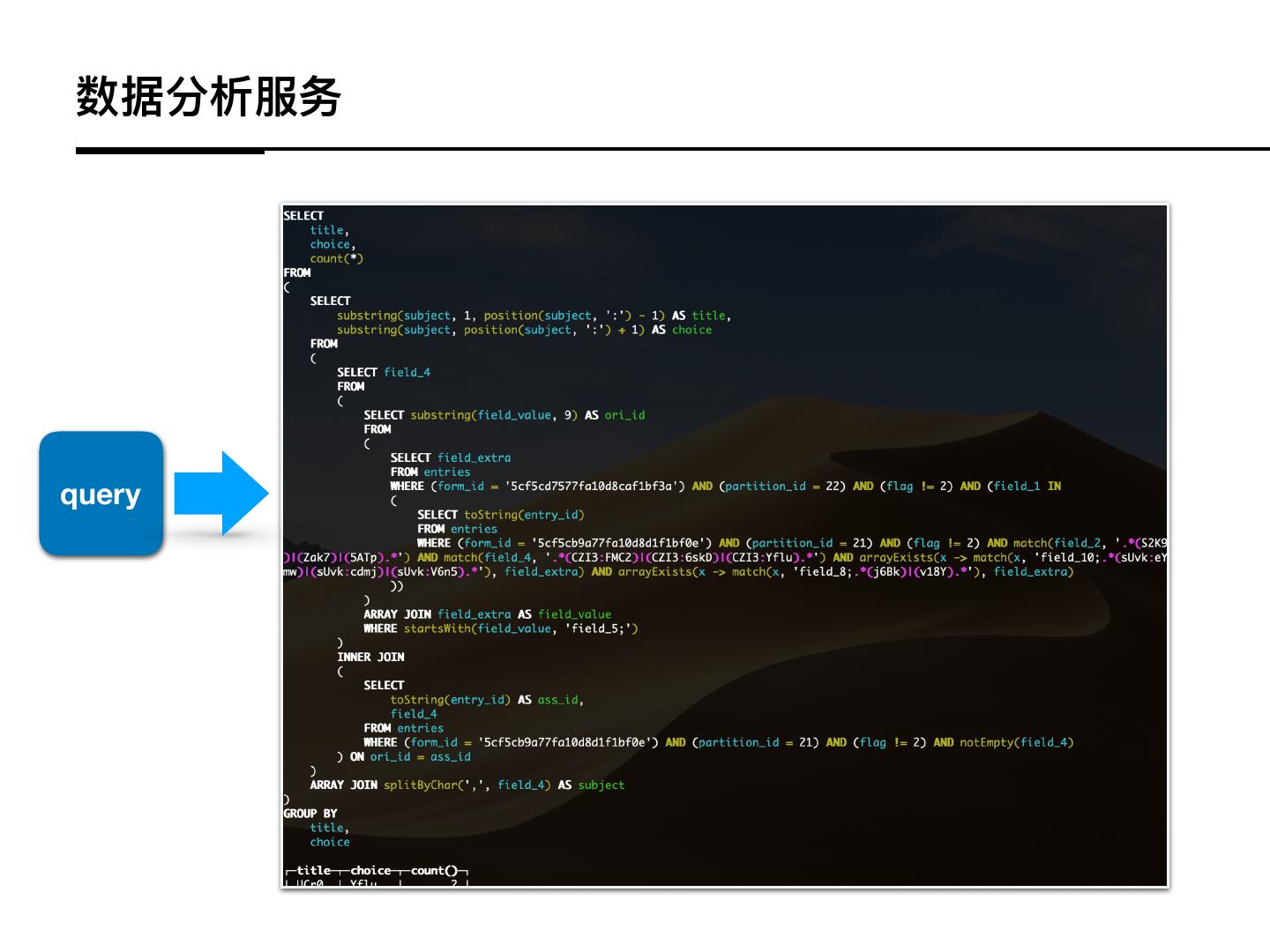 18 .数据字段的映射 Document Struct MongoDb Clickhouse [“SEWS”, “DSES”] select choice, count(*) from entries_test ARRAY JOIN splitByChar(',', field_1) as choice group by choice SqlDB ”SEWS,DSES” ADB with T2 as (select split_part (a.field_1, ',', b.subindex) as choice, 1 as count from `entry_0002` as a join incre_table as b on b.subindex < (length(a.field_1) - length(replace(a.field_1,','))+1)) select choice, COUNT(*) FROM T2 GROUP BY choice
