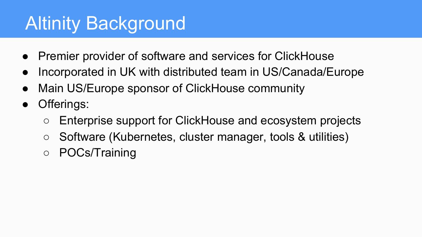 3 .Altinity Background ● Premier provider of software and services for ClickHouse ● Incorporated in UK with distributed team in US/Canada/Europe ● Main US/Europe sponsor of ClickHouse community ● Offerings: ○ Enterprise support for ClickHouse and ecosystem projects ○ Software (Kubernetes, cluster manager, tools & utilities) ○ POCs/Training