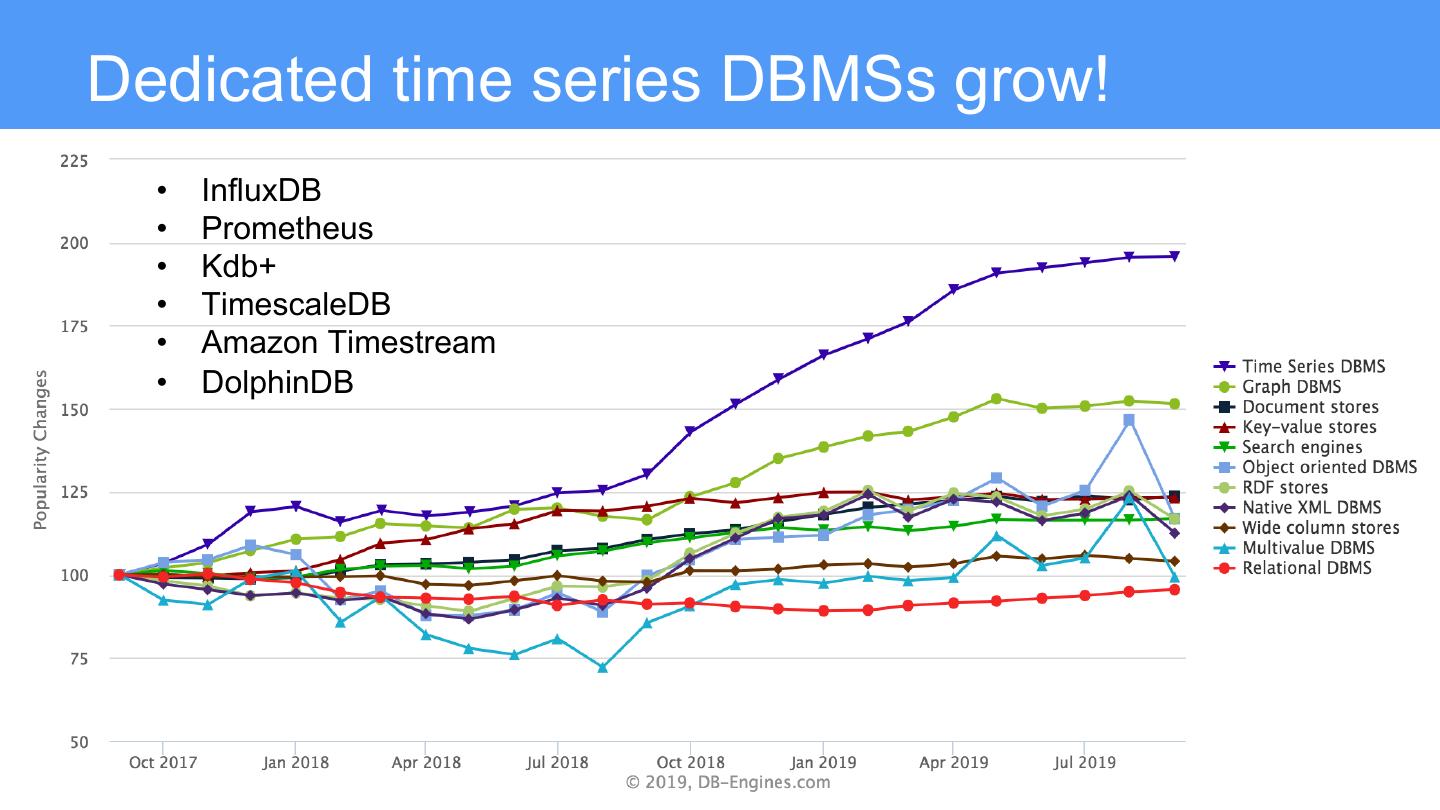 6 .Dedicated time series DBMSs grow! • InfluxDB • Prometheus • Kdb+ • TimescaleDB • Amazon Timestream • DolphinDB