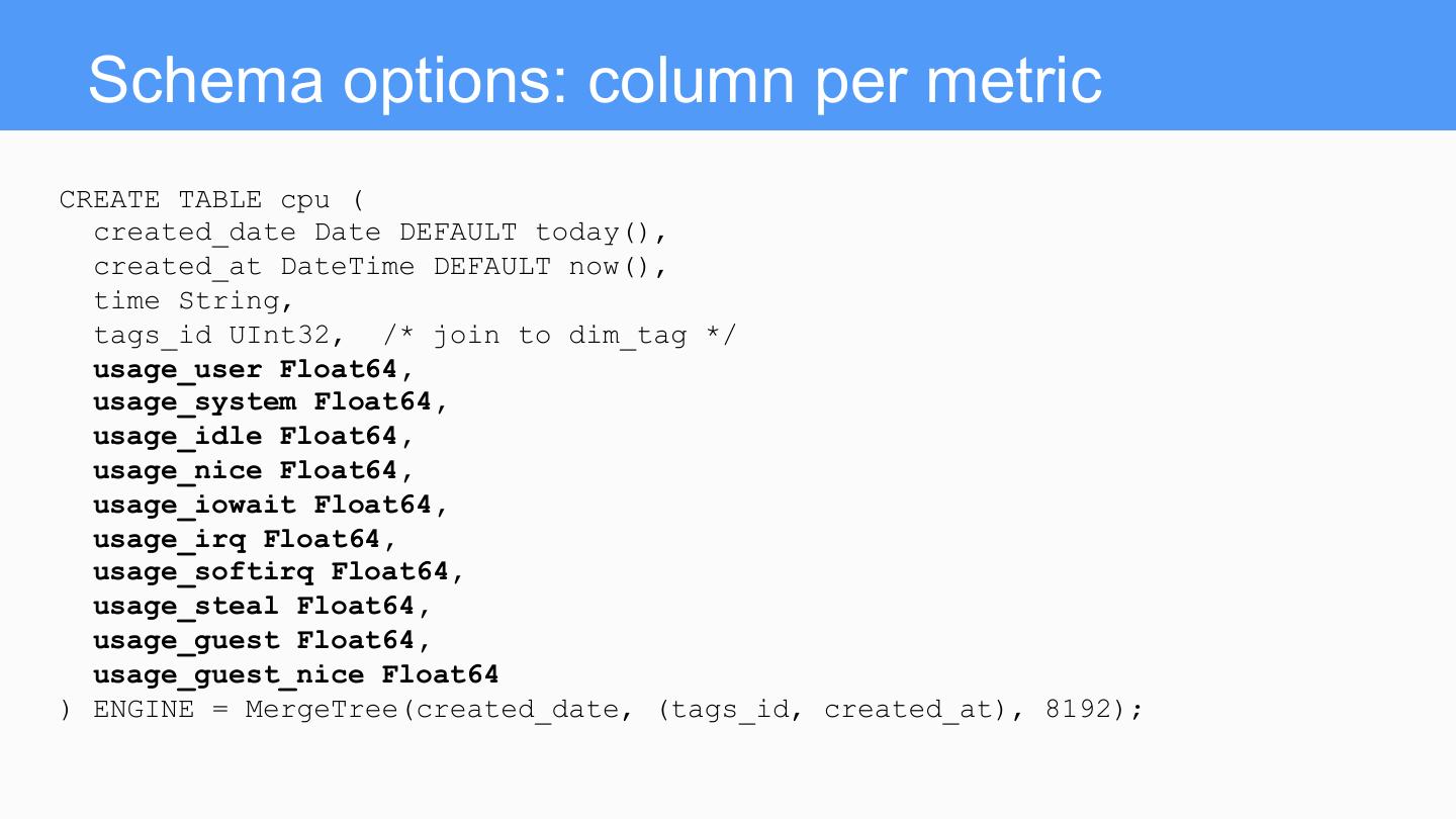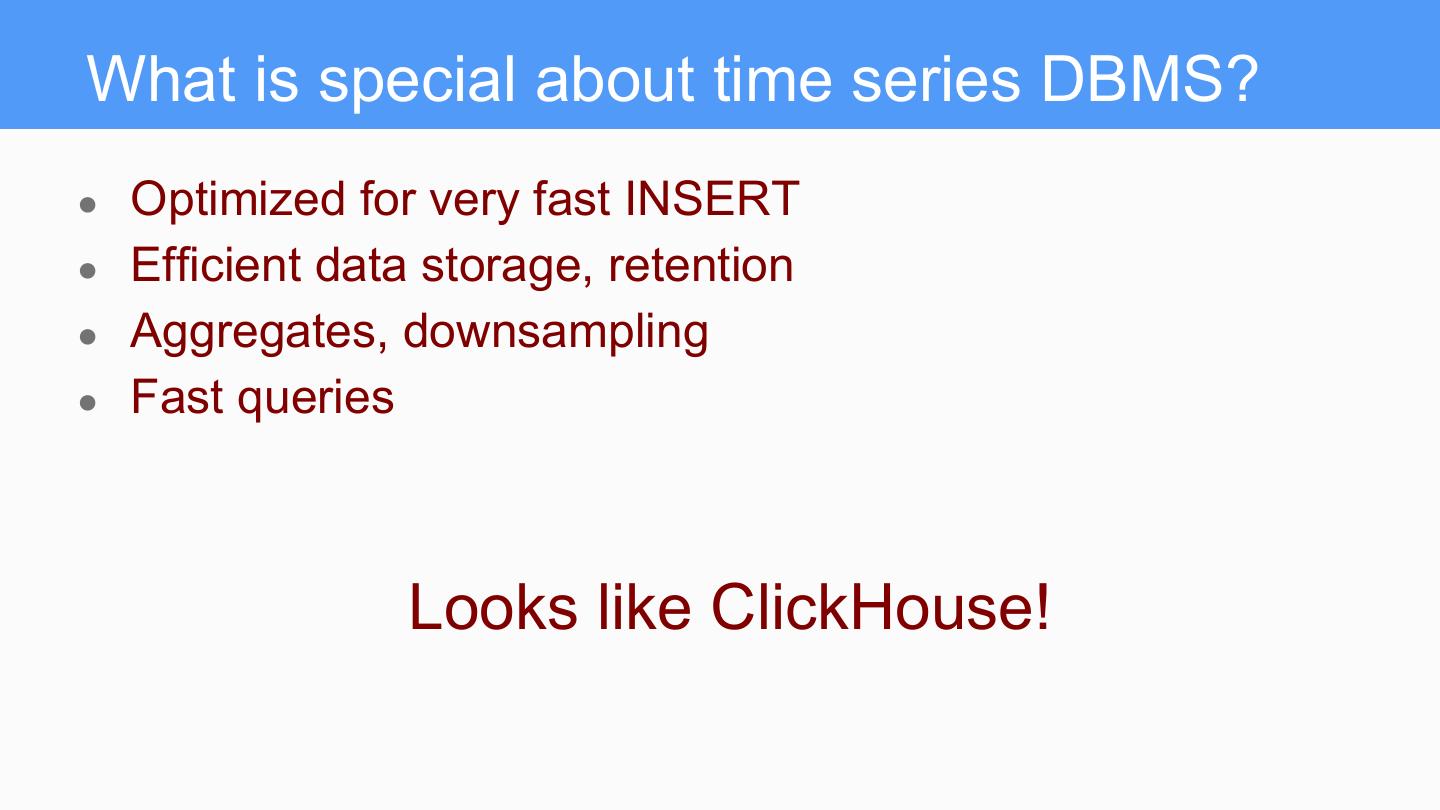7 .What is special about time series DBMS? ● Optimized for very fast INSERT ● Efficient data storage, retention ● Aggregates, downsampling ● Fast queries Looks like ClickHouse!