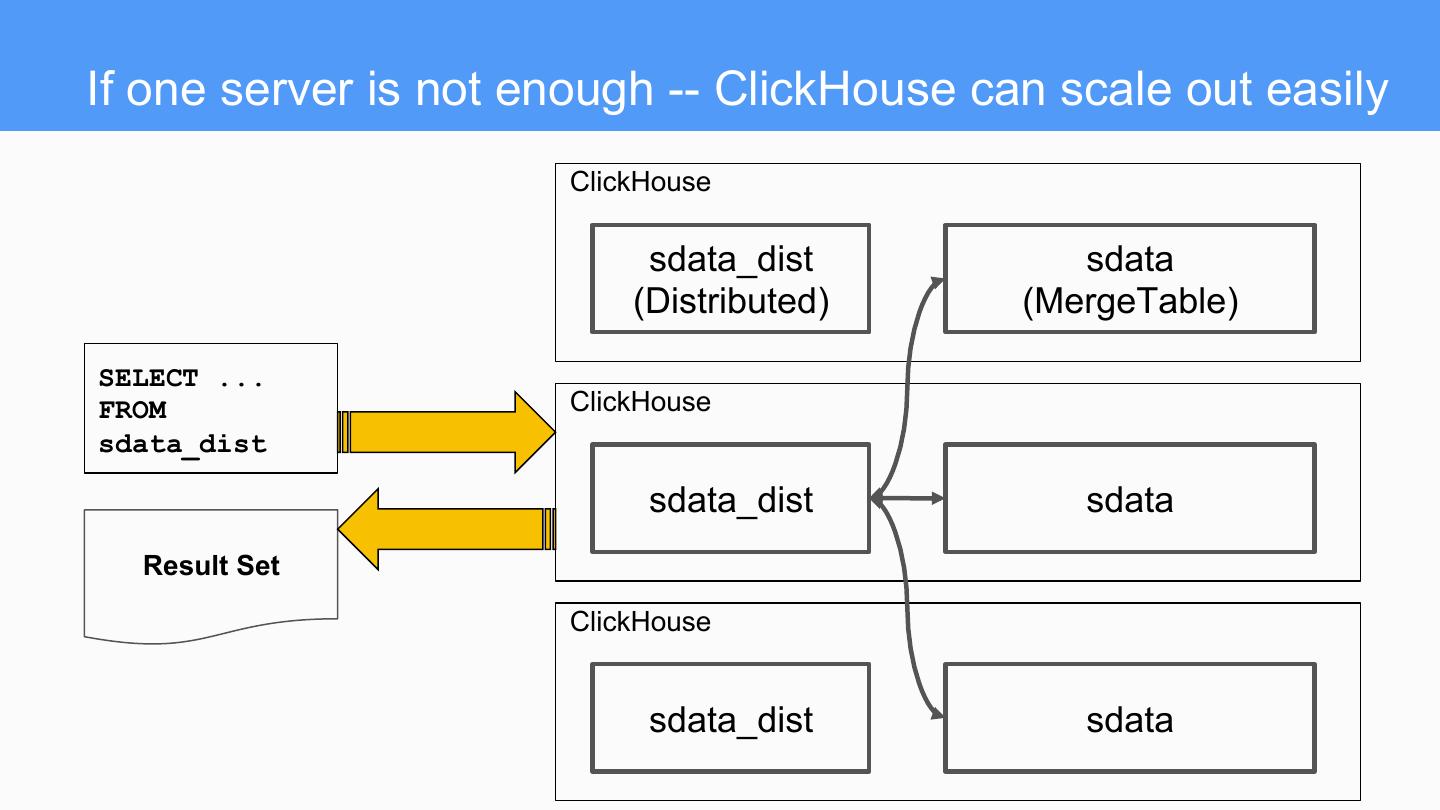 14 .If one server is not enough -- ClickHouse can scale out easily ClickHouse sdata_dist sdata (Distributed) (MergeTable) SELECT ... FROM ClickHouse sdata_dist sdata_dist sdata Result Set ClickHouse sdata_dist sdata
