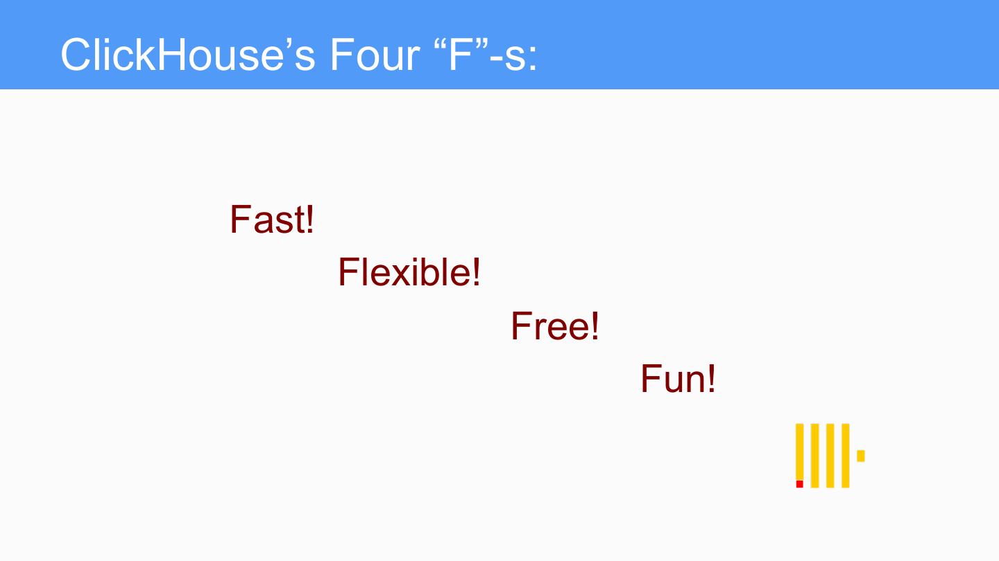 17 .ClickHouse’s Four “F”-s: Fast! Flexible! Free! Fun!