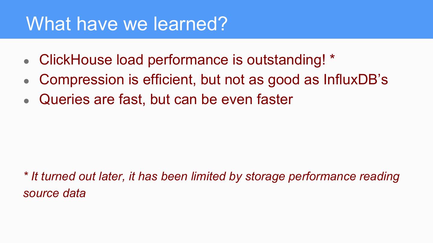 28 .What have we learned? ● ClickHouse load performance is outstanding! * ● Compression is efficient, but not as good as InfluxDB’s ● Queries are fast, but can be even faster * It turned out later, it has been limited by storage performance reading source data